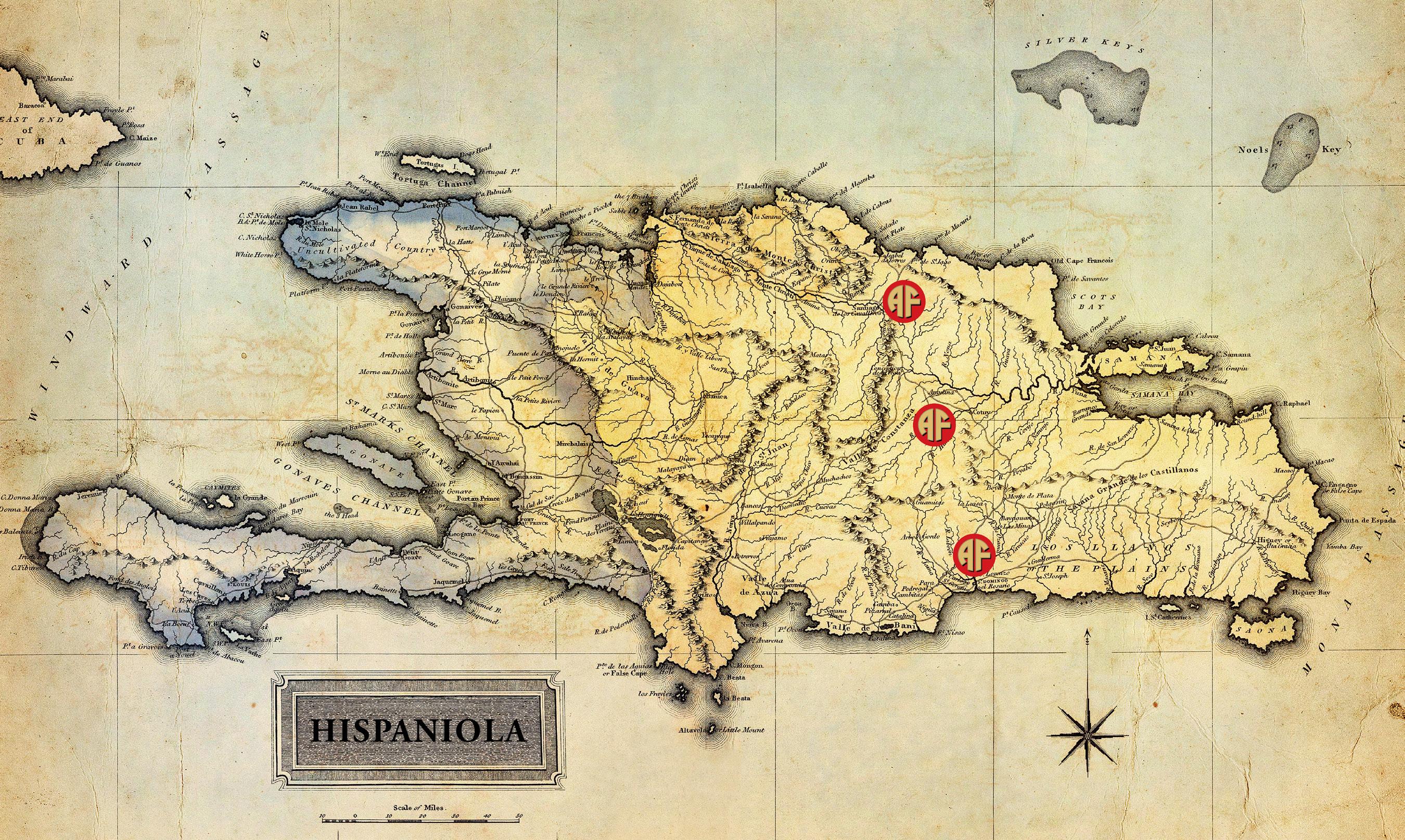 Mapa de 1823 de La Isla Española, conocida por su nombre en latín, Hispaniola, la isla de las Antillas dividida en dos naciones (República Dominicana y Haití) y en dos idiomas, español y francés respectivamente. El mapa indica las ubicaciones de Tabacalera A. Fuente y Cía. en territorio dominicano: Santiago de los Caballeros; Château de la Fuente, en Caribe, Bonao; y el Arturo Fuente Cigar Club, en Santo Domingo. // An 1823 map of La Isla Española, known by its Latin name, Hispaniola, the West Indies island divided into two nations—the Dominican Republic and Haiti—and two languages, Spanish and French, respectively. The map notes the Dominican locations of Tabacalera A. Fuente y Cia, in Santiago de los Caballeros; Château de la Fuente, in Caribe, Bonao; and the Arturo Fuente Cigar Club, in Santo Domingo. (Foto //
