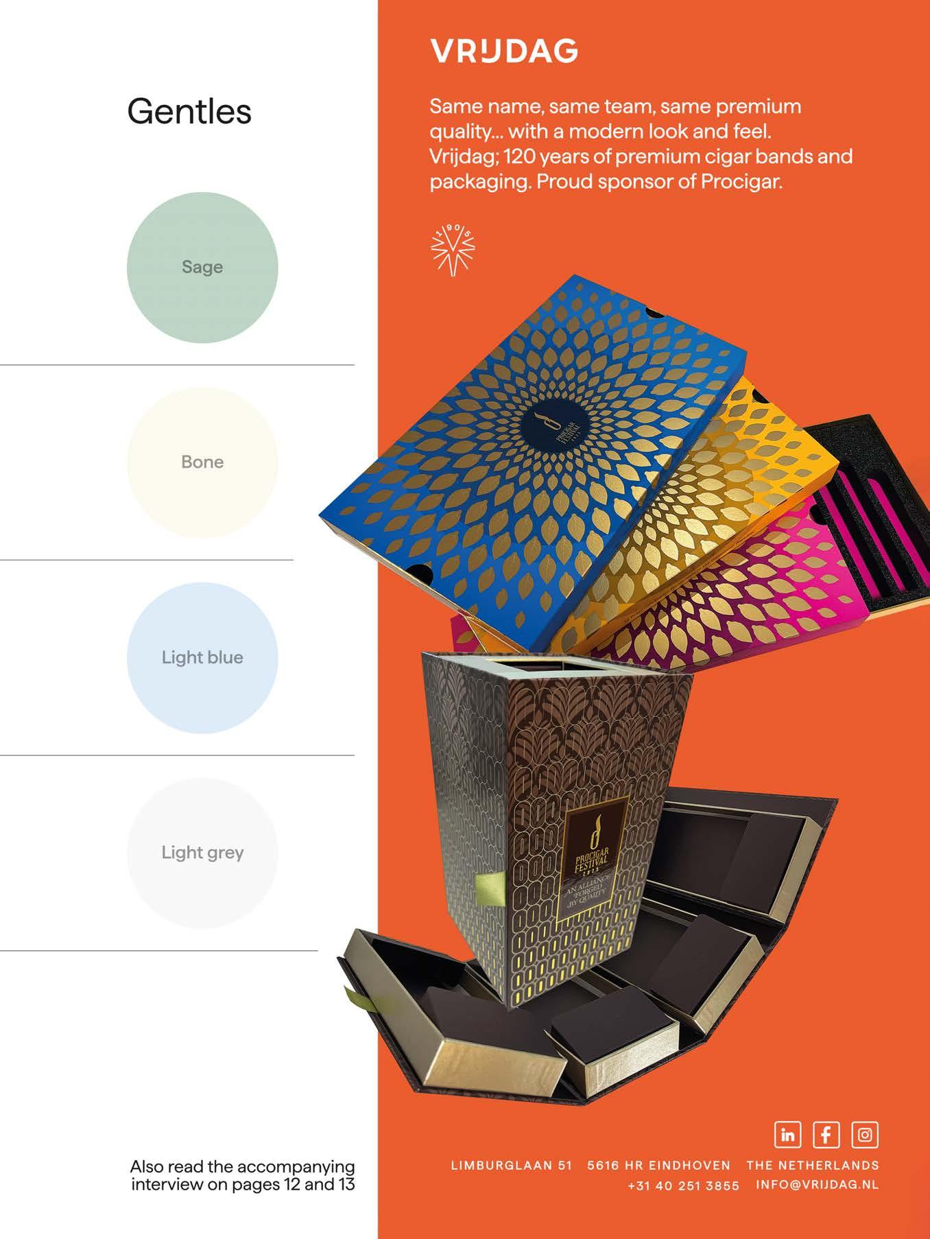 HN: Nuestra relación con Procigar se remonta a principios de este siglo. Somos miembros orgullosos de PROCIGAR y, por ejemplo, fabricamos los sellos de garantía que los miembros de PROCIGAR añaden a sus cajas de cigarros. Vrijdag también es patrocinador del Festival PROCIGAR. Desde hace muchos años, fabricamos la caja de cigarros que se incluye en la bolsa de regalos para los participantes del Festival. Y también la caja de cigarros para los visitantes de la Noche de Gala es fabricada por Vrijdag. Como cada año, espero con ilusión el Festival PROCIGAR 2025. Una semana apasionante, perfectamente organizada y con un gran ambiente.