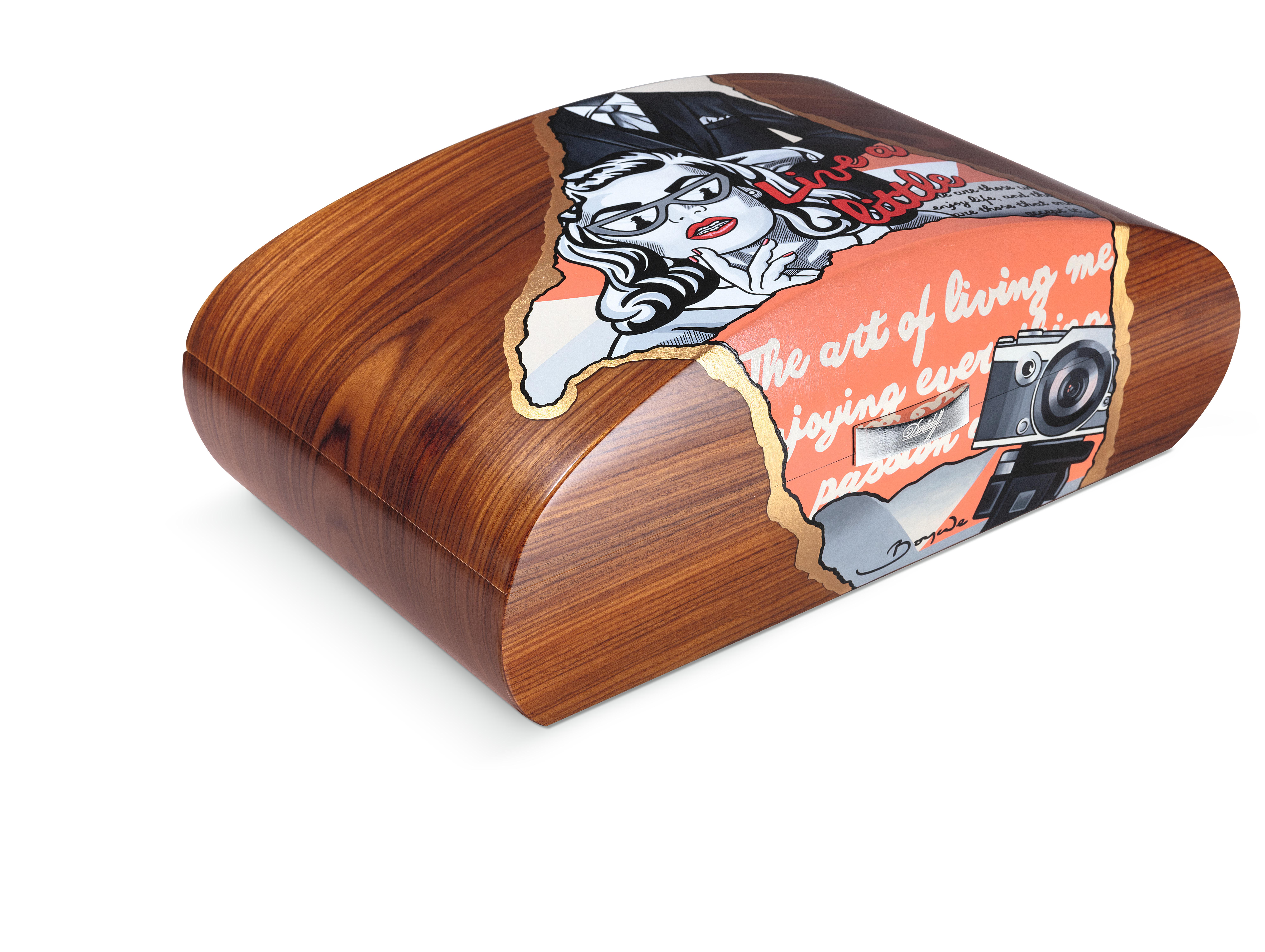 Fotos: oettInger DavIDoFF agDavidoff Cigars is delighted to announce its collaboration with British pop art artist Boyarde Messenger. The global brand for premium cigars and accessories launches an ultra-limited Masterpiece humidor collection of its Dome humidor, with each of the five available pieces displaying an exceptional artwork by Boyarde. Furthermore, all humidors come with specially crafted cigars, which are unique to each piece.