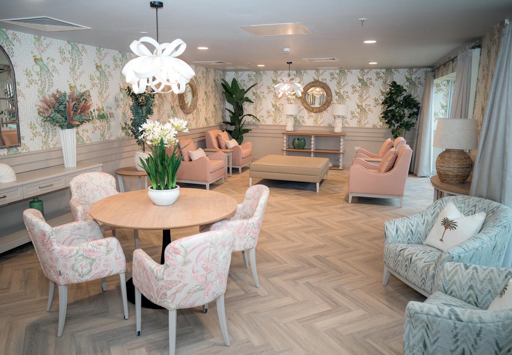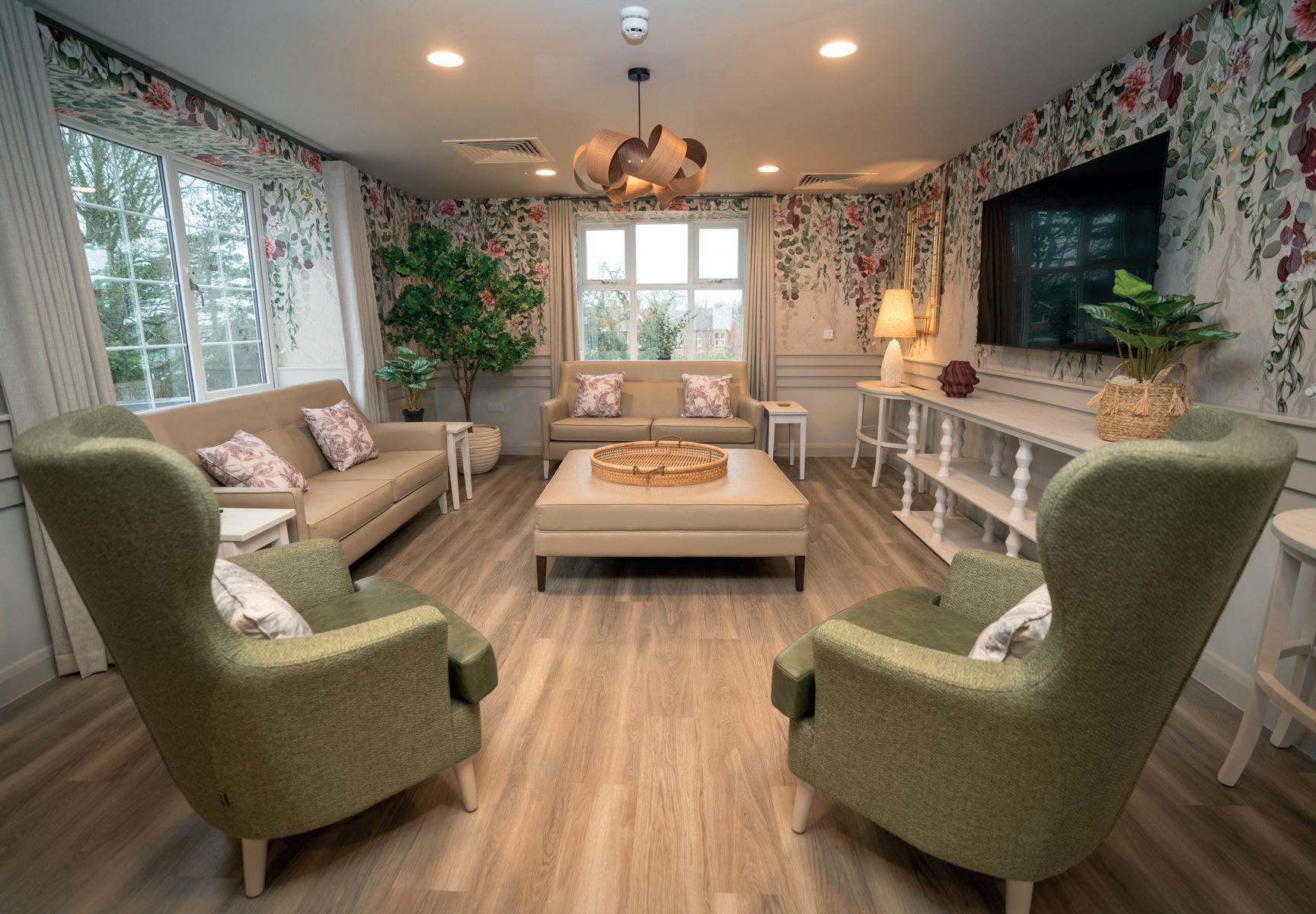 One of Aston Manor’s standout features is its community hub, which has far exceeded expectations. At the time of our interview, the home had just 10 residents, but the hub’s facilities, such as the hair salon, cinema room, and private dining area, have already made a significant impact. The hair salon is used daily, and the cinema room, with its daily film schedule, has quickly become a favourite among families, who enjoy bringing their children to the home. The piano room is another unique touch, offering opportunities for social activities such as gin-andtonic evenings.