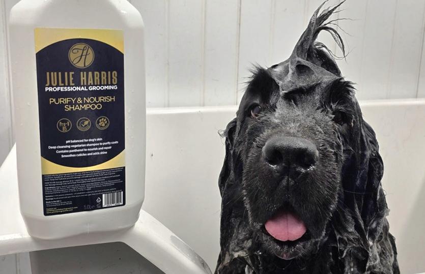 Julie Harris Professional Grooming Purify & Nourish 2 in 1 deep cleansing and conditioning shampoo. Now with a little conditioner to complete the wash by moisturising the skin, sealing the cuticles, and adding shine. Suitable for all dogs. Safe and gentle vegetarian ingredients, kind to hands, dilute 20:1. 5L gives >200 hydrobaths.