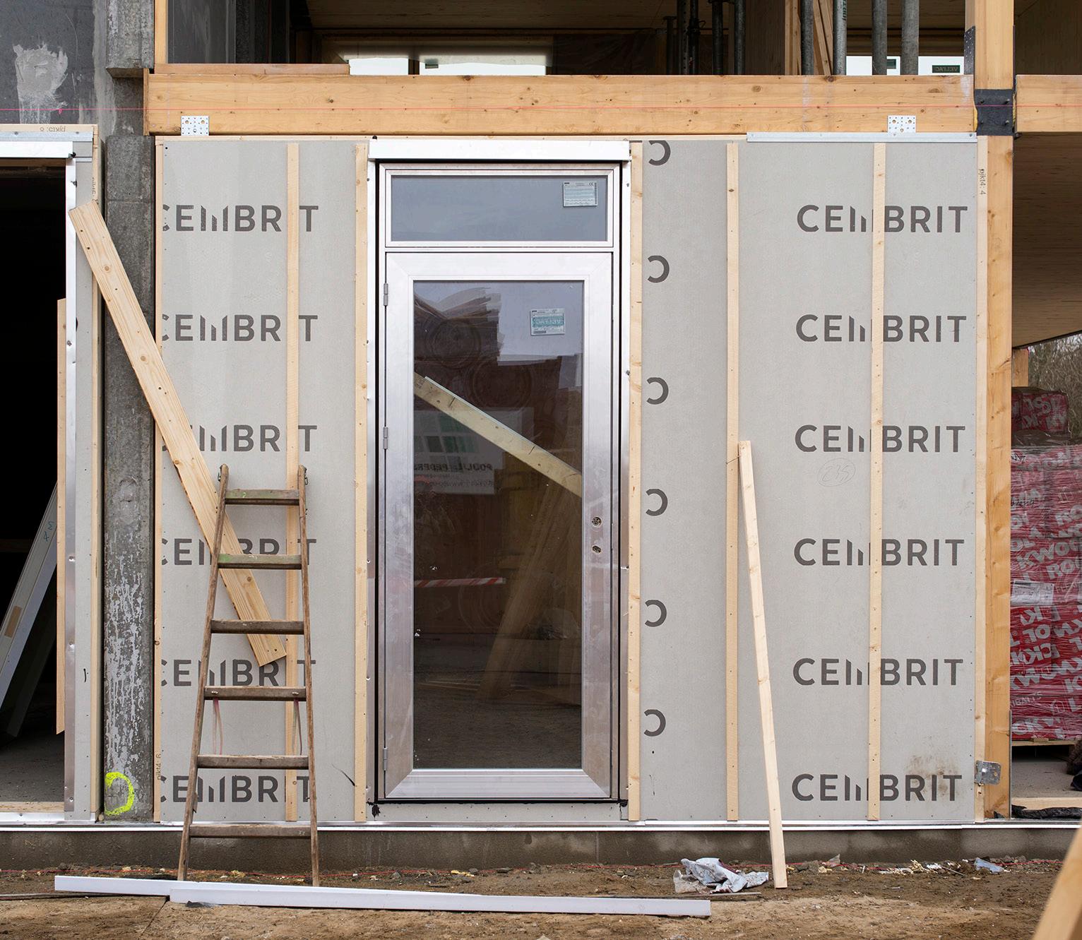 Byggeriet er alene monteret ved hjælp af kran. Stilladset på billedet er udelukkende nødvendigt for at skaffe adgang til tagfladen i forbindelse med montagen af pandeplader. Den afsluttende facade beklædning i lærketræ er ligeledes udført fra en platfom.