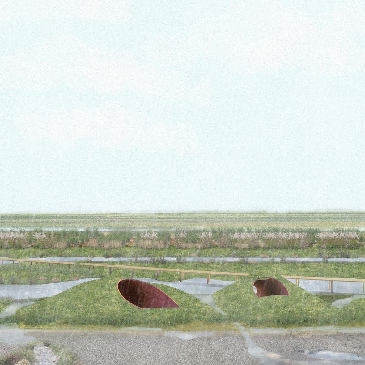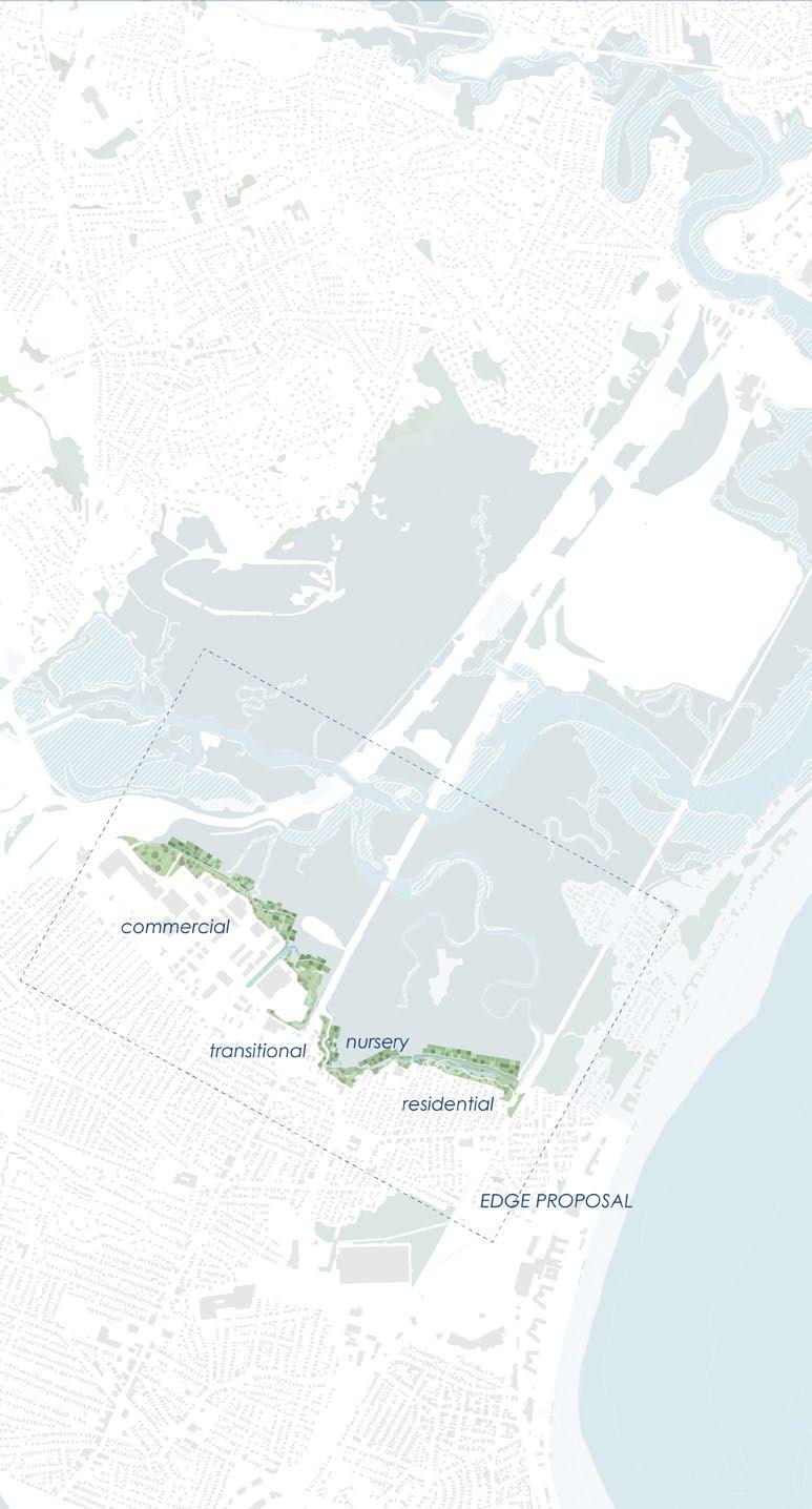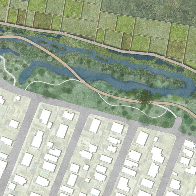 The project aims to rethink the edge between the city and nature, considering the extensive processes and material flows in infrastructure construction. A new intervention will guide water management more intentionally. The proposal divides the edge into three zones—commercial, transitional, and residential—based on land use and connection to the marsh.