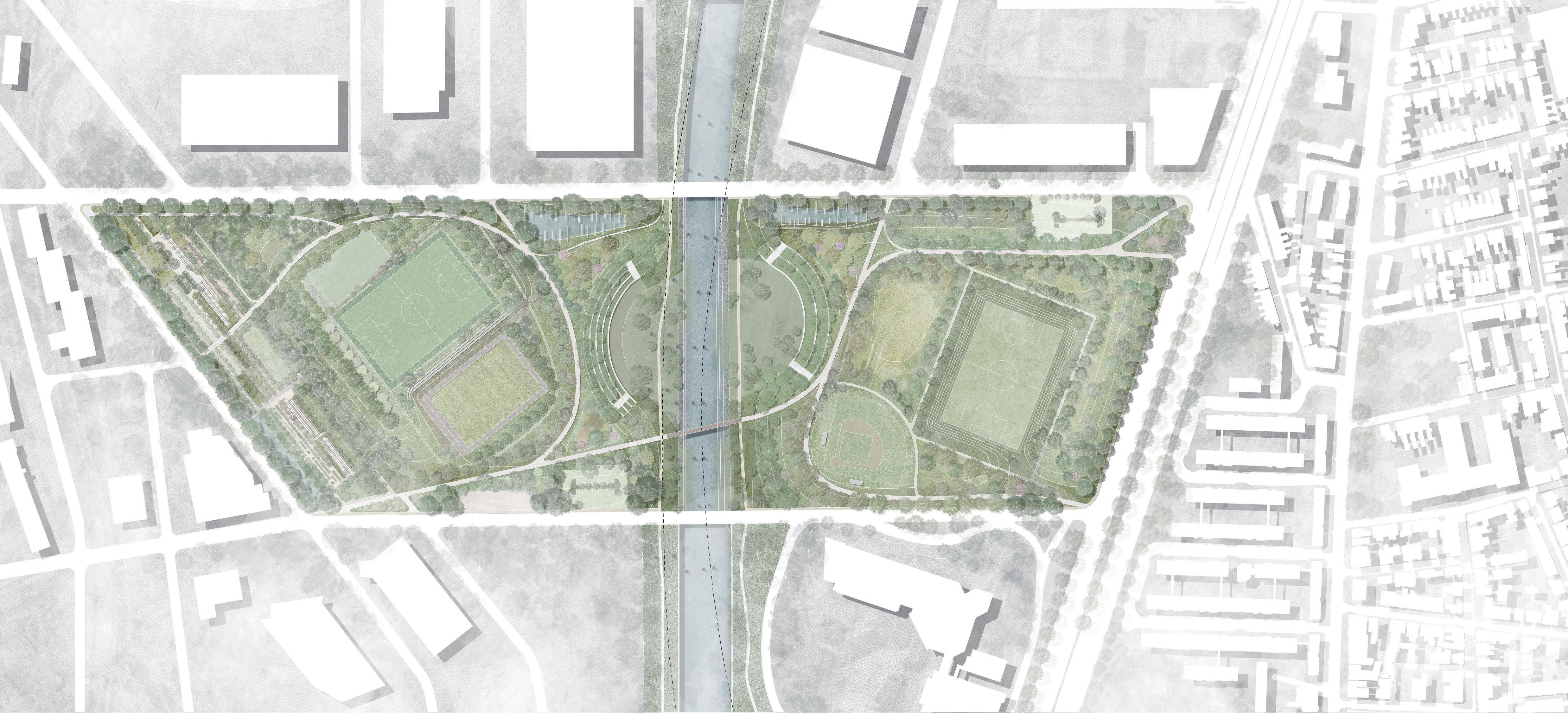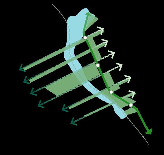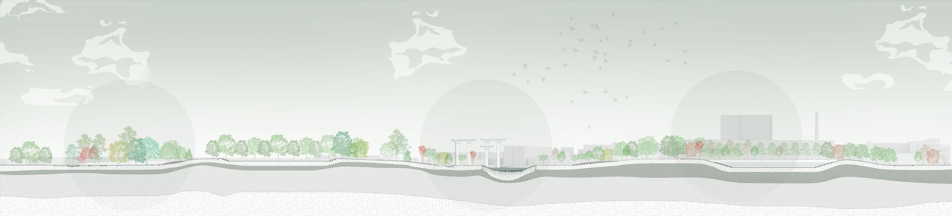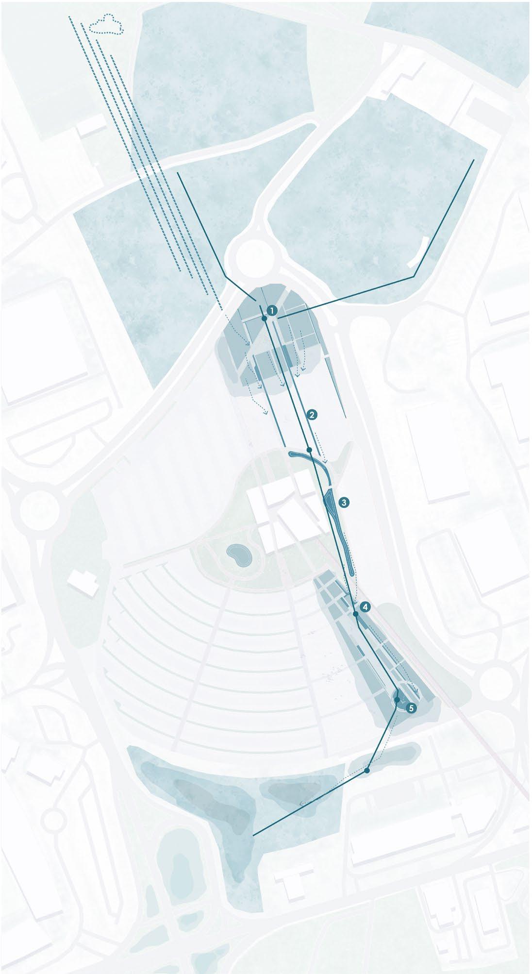 The project aims to rethink the edge between the city and nature, considering the extensive processes and material flows in infrastructure construction. A new intervention will guide water management more intentionally. The proposal divides the edge into three zones—commercial, transitional, and residential—based on land use and connection to the marsh.