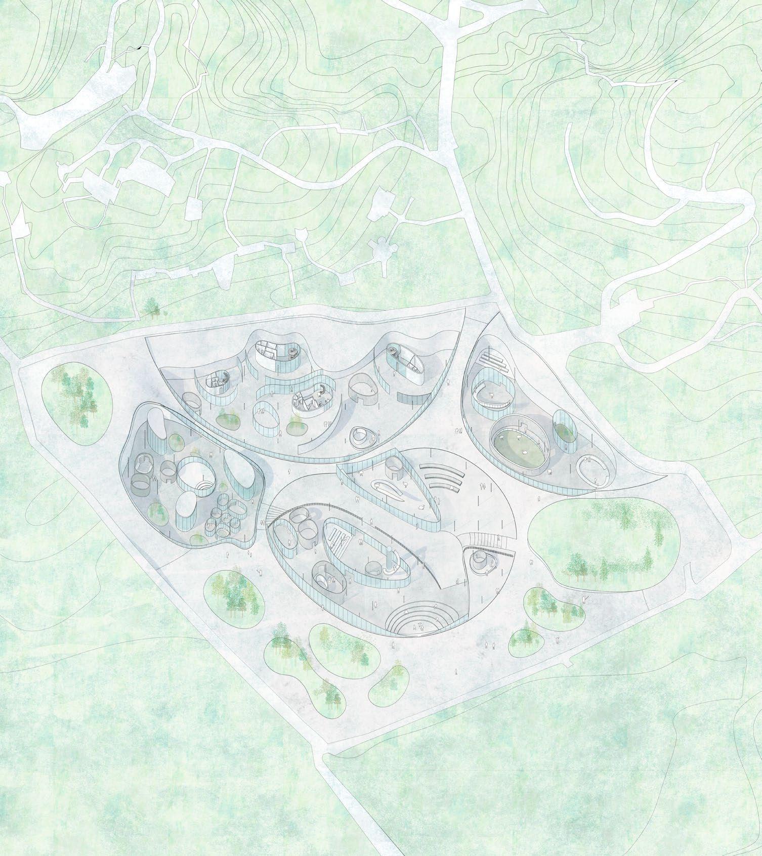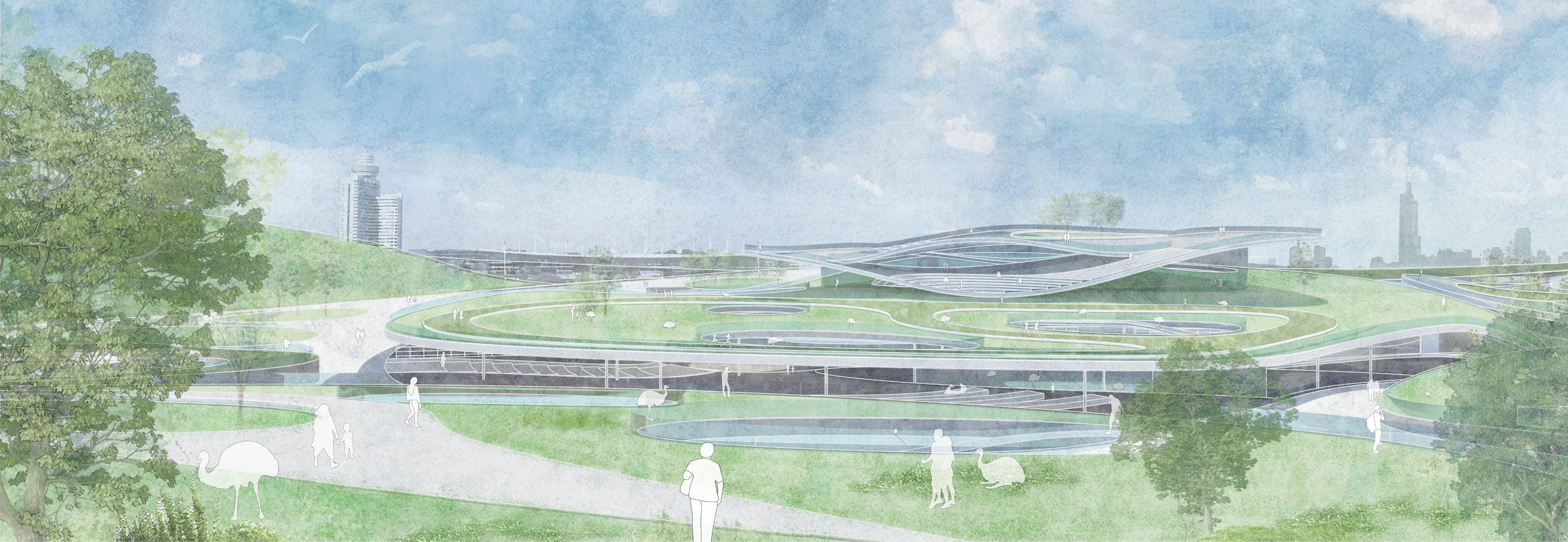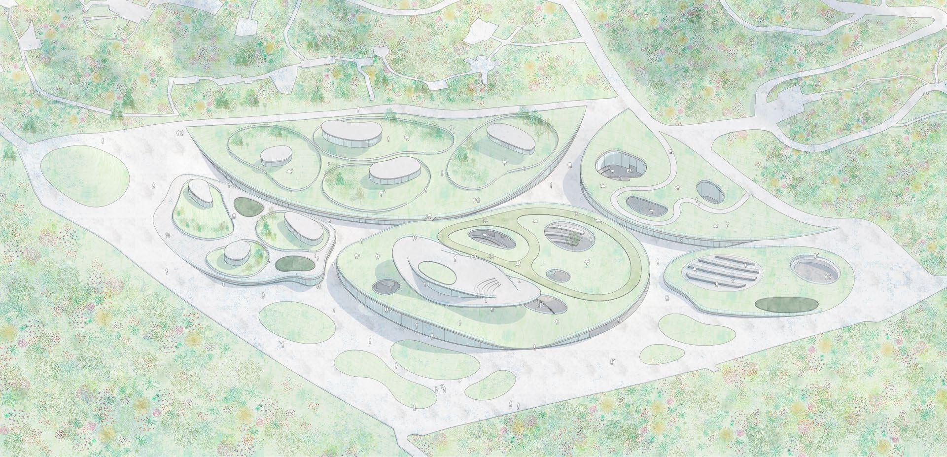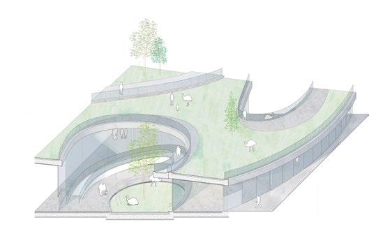 The design forms the architectural language through the contour lines of the terrain, and expresses the architectural form through the contour lines extending from the mountains to the city boundary like folding a paper. The relationship between human and nature, human and animals should be one that meet with each other but does not affect each other. Aims to both serve as an extension of the zoo and a middle ground between the