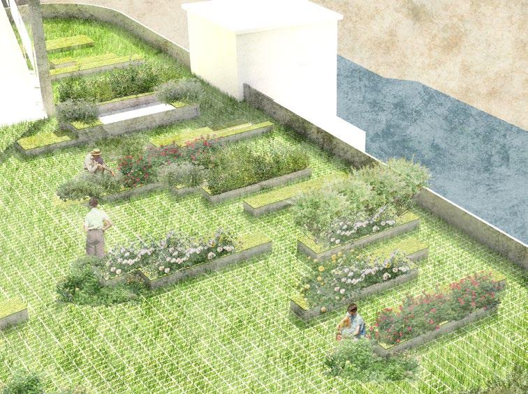 The design restructures the landscape through Perugia’s geometric logic of crossroads and movement, drawing inspiration from the figure–ground patterns of the city. Intersecting geometries shape new paths, plazas, and planted zones, while water becomes the primary driver of the landscape strategy. Following the natural slope of the terrain, stormwater is slowed, channeled, and absorbed through bioswales, runnels, and a retention pond. These interventions not only address flooding but also reduce heat and enhance the green–blue network of the district. Ultimately, the redesign of Parking Lots 1–3 aims to become both a community hub and an ecological corridor, strengthening Perugia’s resilience while supporting its vibrant event culture.