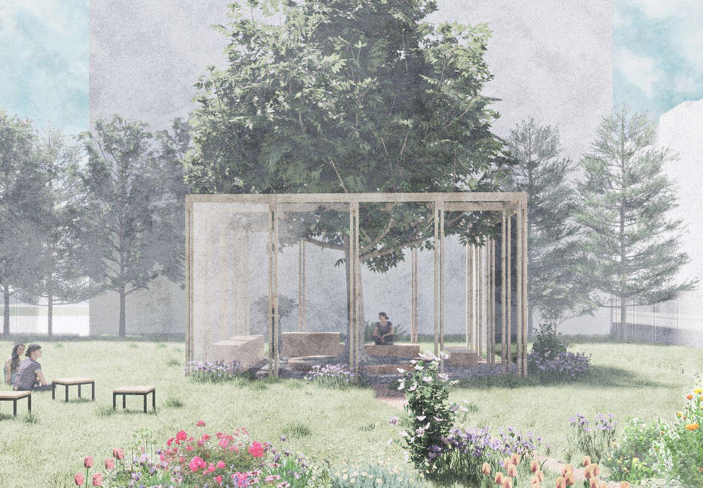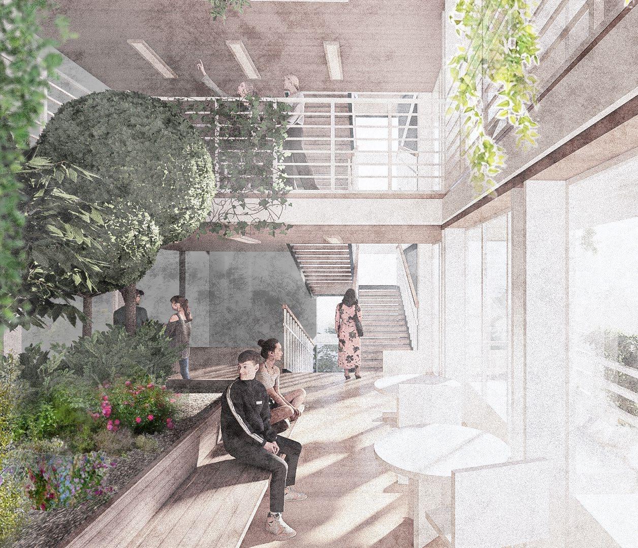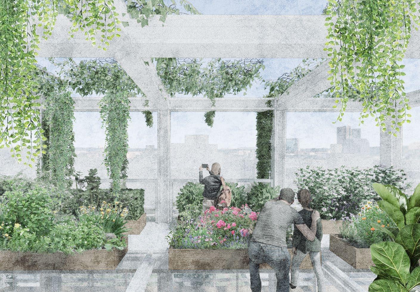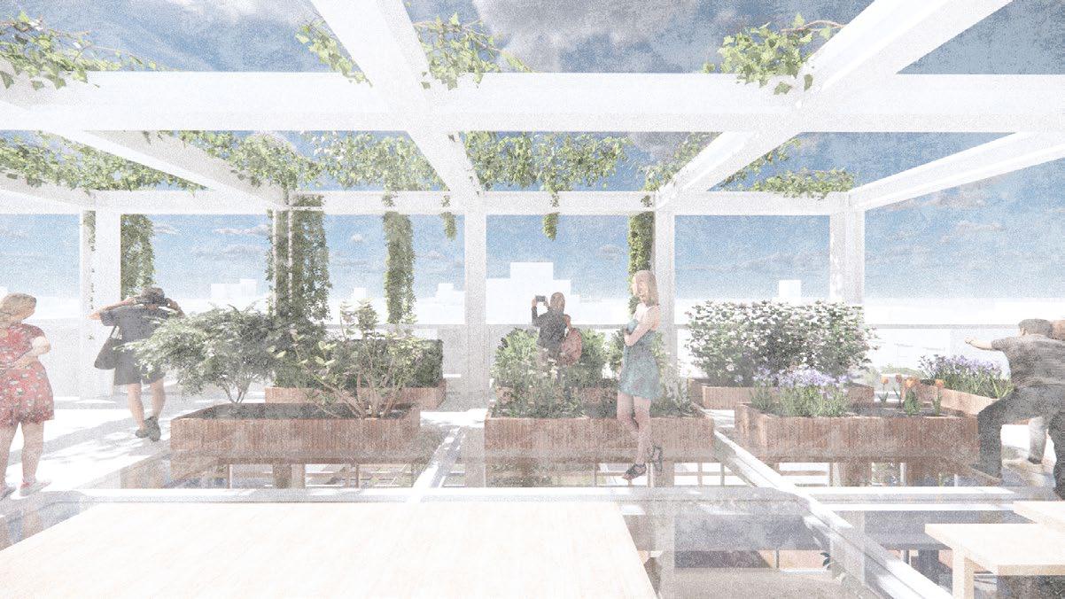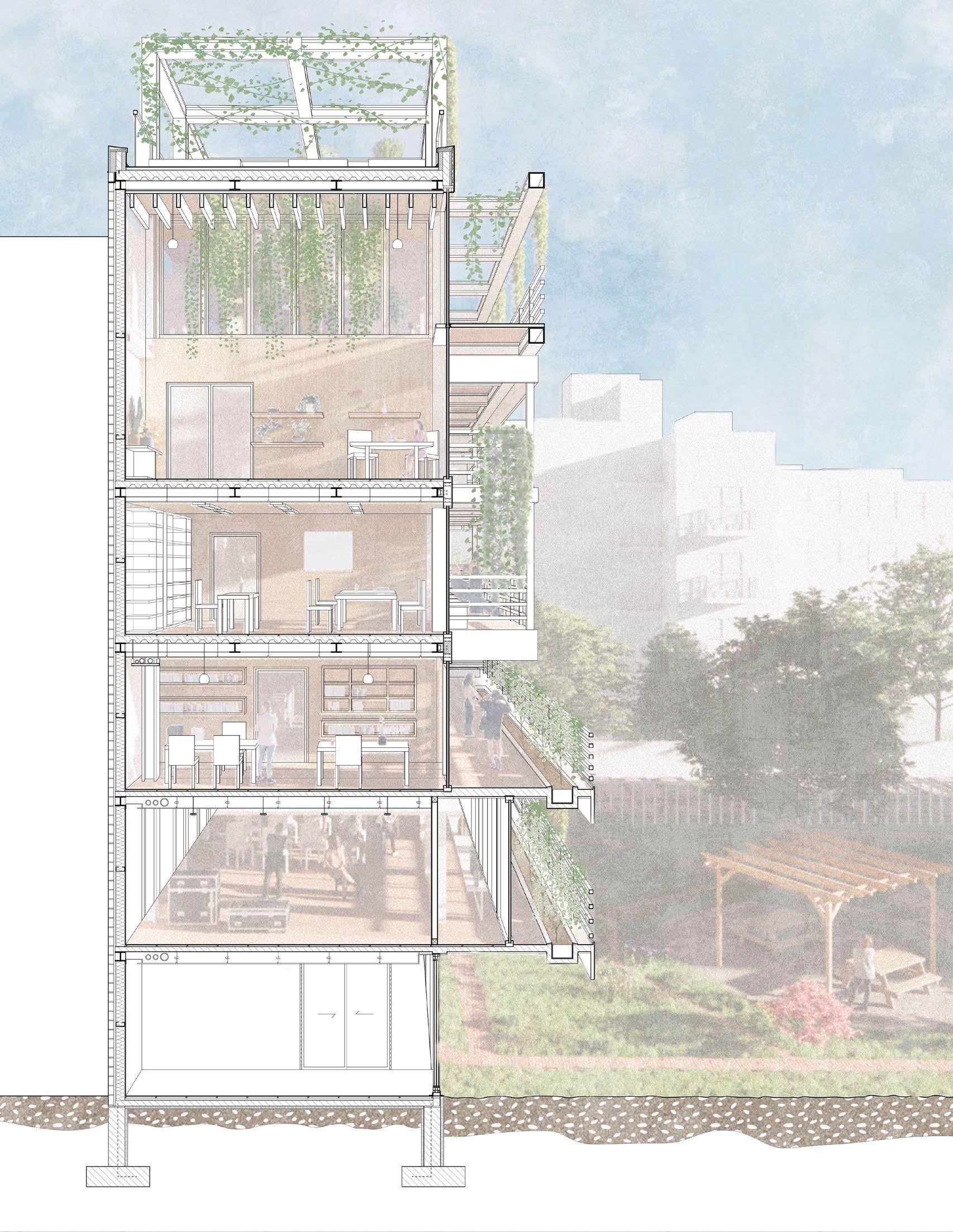 Through strategic architectural interventions, such as integrating performance stages within existing tree plots and optimizing limited space like the current facade facing the community garden, we aim to offer panoramic views of the greenery while providing standing seating for performance viewing. Additionally, the introduction of a rooftop planting and resting area transforms this space into a focal point for community gatherings and cultural events, harmoniously blending nature and culture within the urban landscape.