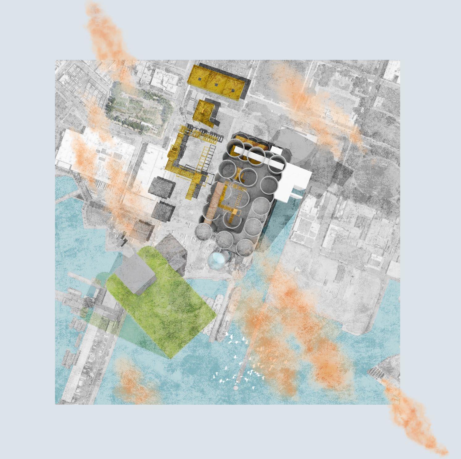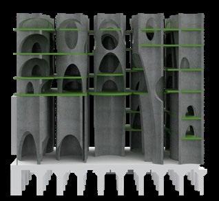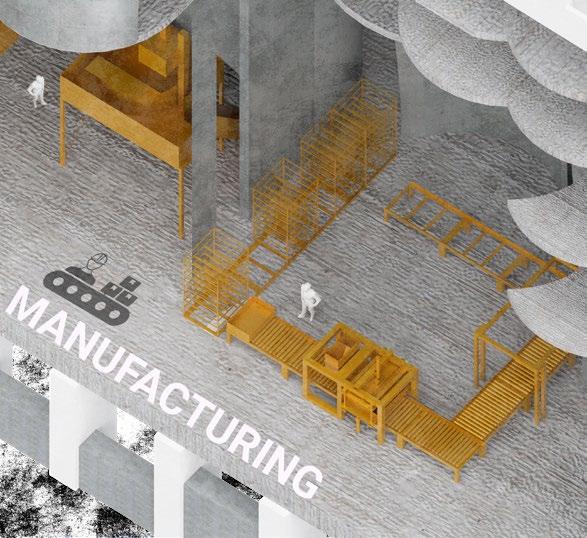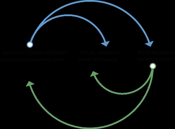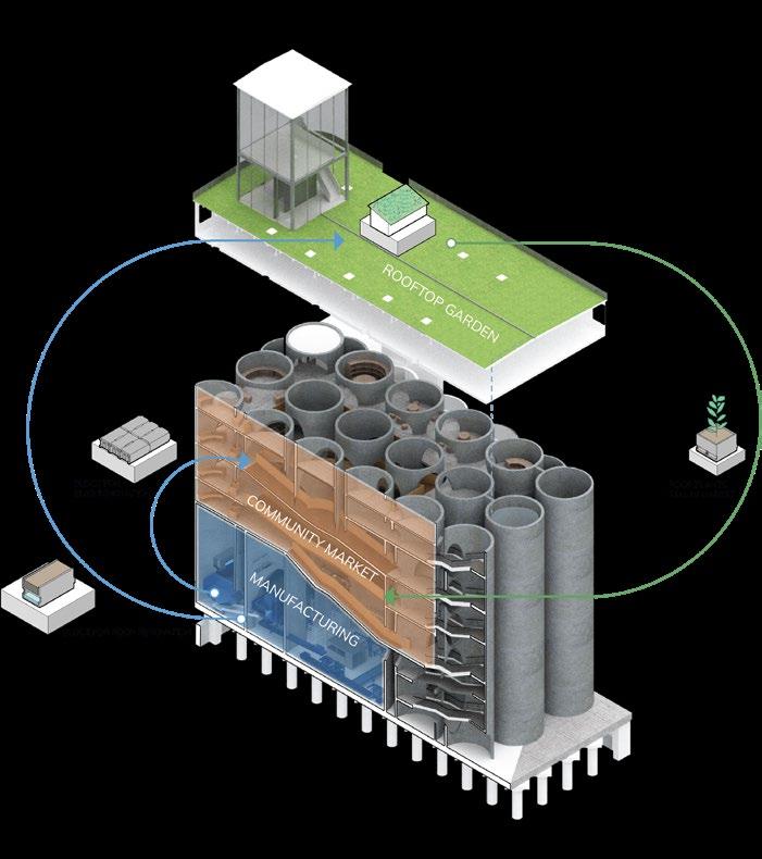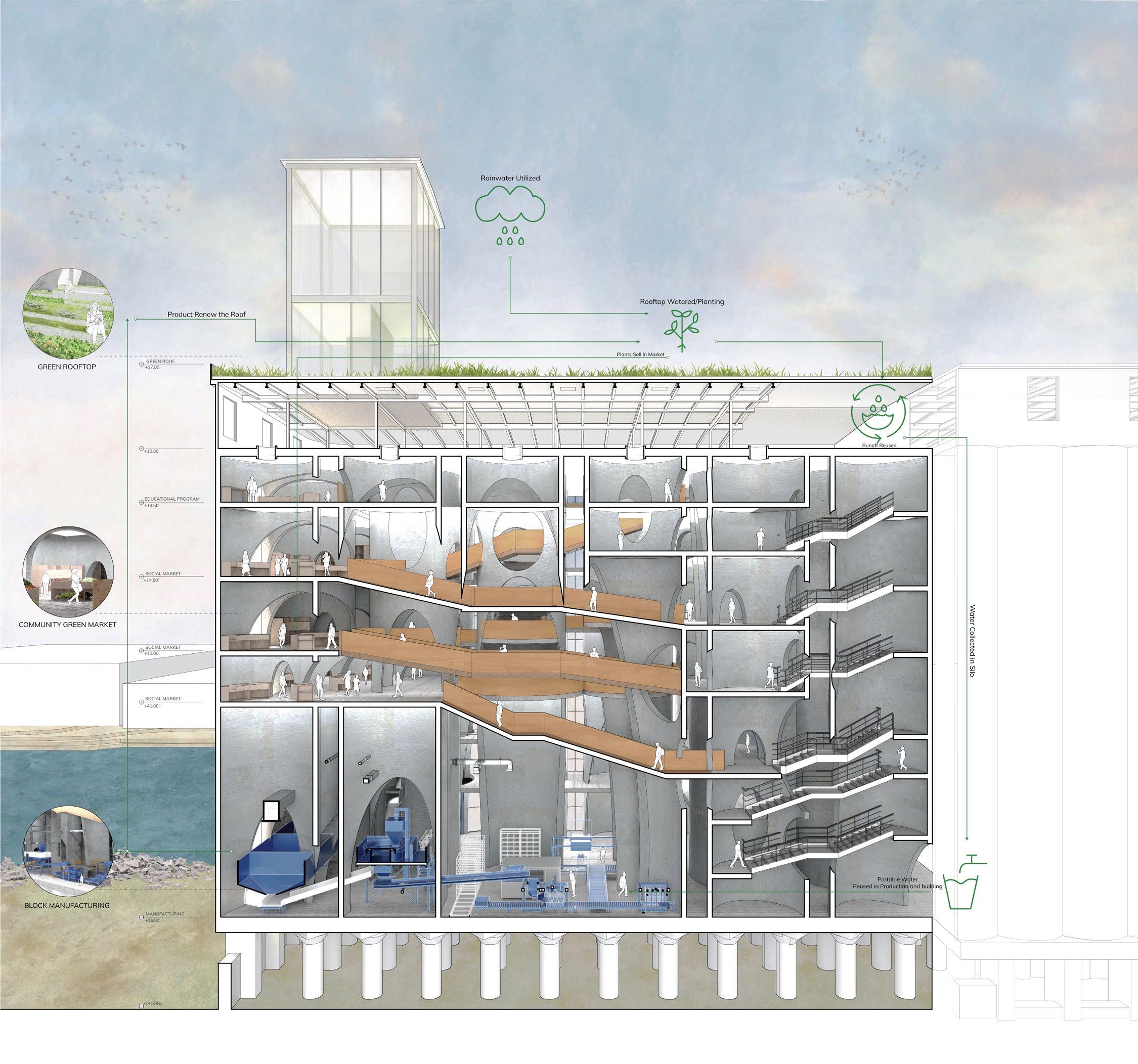 The three key programs harmonize effortlessly, as block manufacturing and slab creation complement roof and market initiatives. The rooftop cultivation of vegetation not only contributes to a self-sustaining community market but also promotes collaboration with nearby Brooklyn farms. This integrated approach not only facilitates the exchange of goods but also enriches community relationships by providing a dedicated space for planting and communal activities.