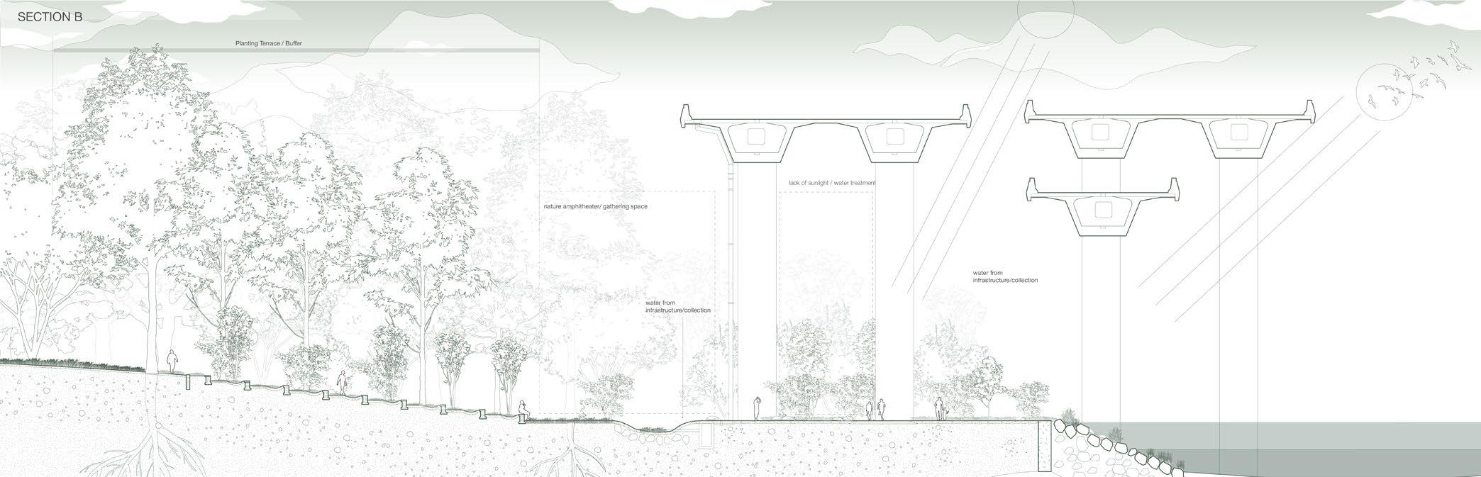 The proposed edge corridor will transform the neglected boundaries into vibrant, green spaces by integrating water filtration, marsh restoration, and infrastructure reuse. Stormwater will be treated through filtration layers, and recycled materials, such as salvaged pipes and concrete, will be used for erosion control, pavers, and permeable surfaces.