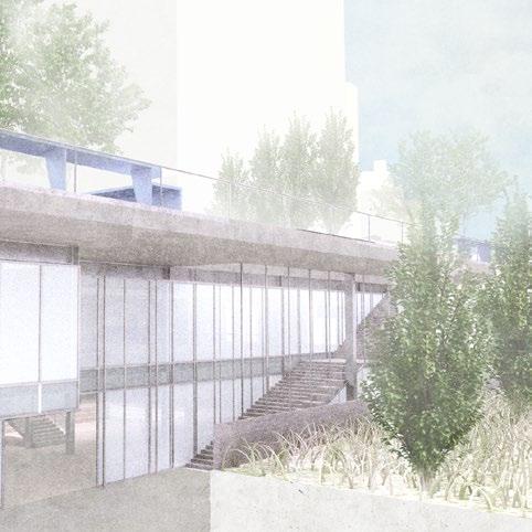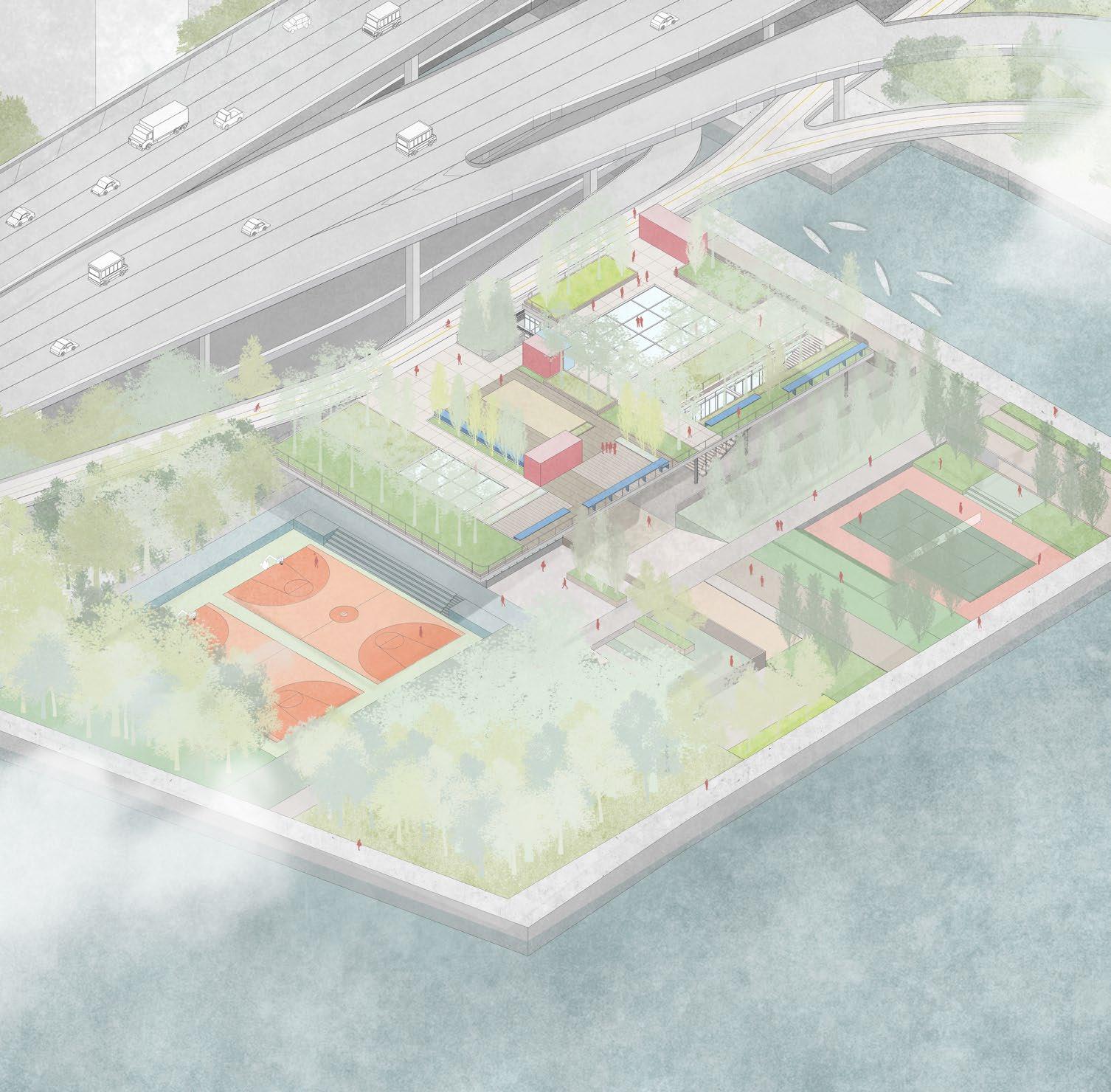 The design aims for bringing the public gathering space and the existing nature back to the park. By connecting the rooftop space to the coming flyover as a social platform, the programs oriented facing the waterfront has the potential to maximize the viewing experience and communication. The project also introduces the transparency of boundaries between the interior program and the outdoor nature, blurring the boudaries both in micro and macro scale.