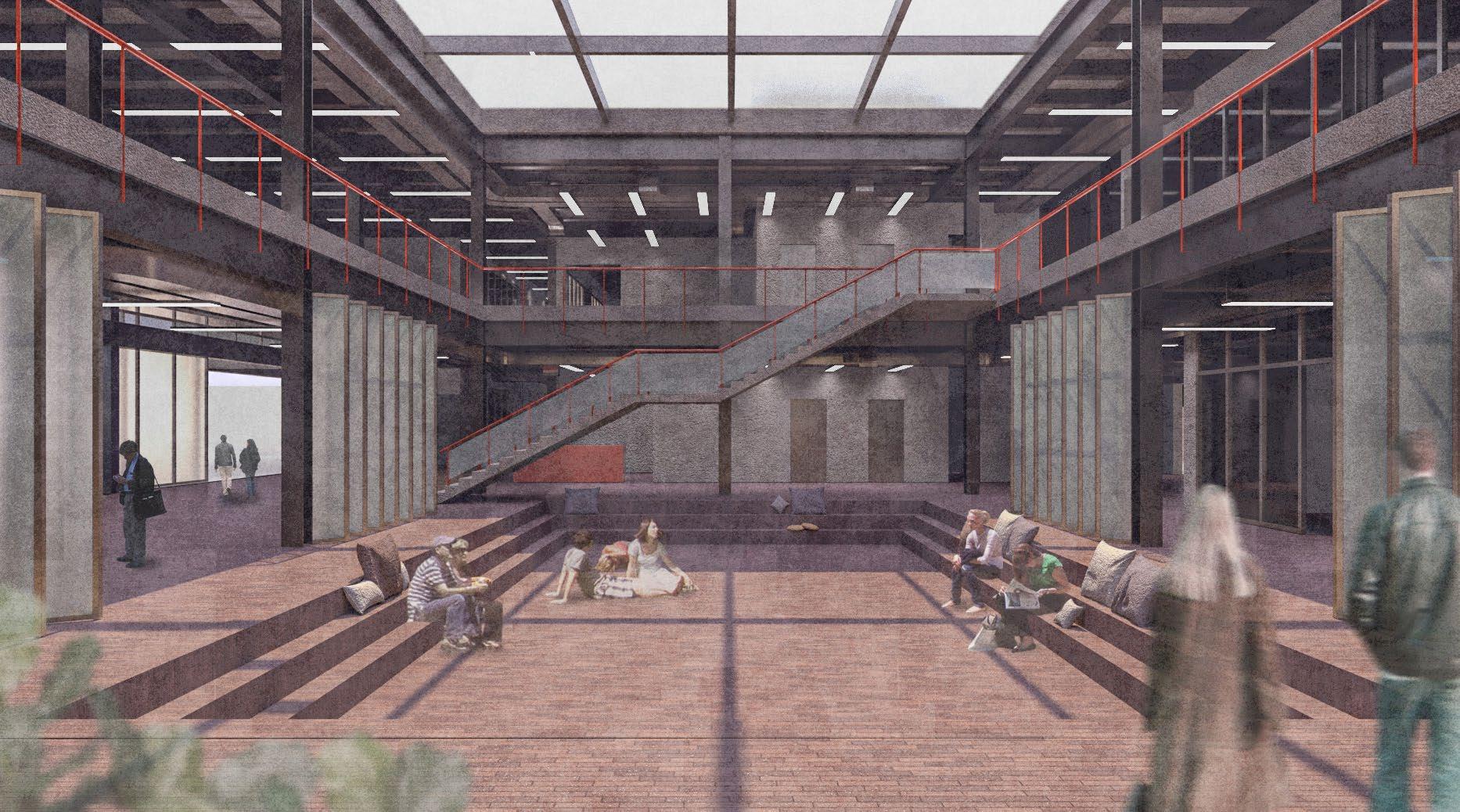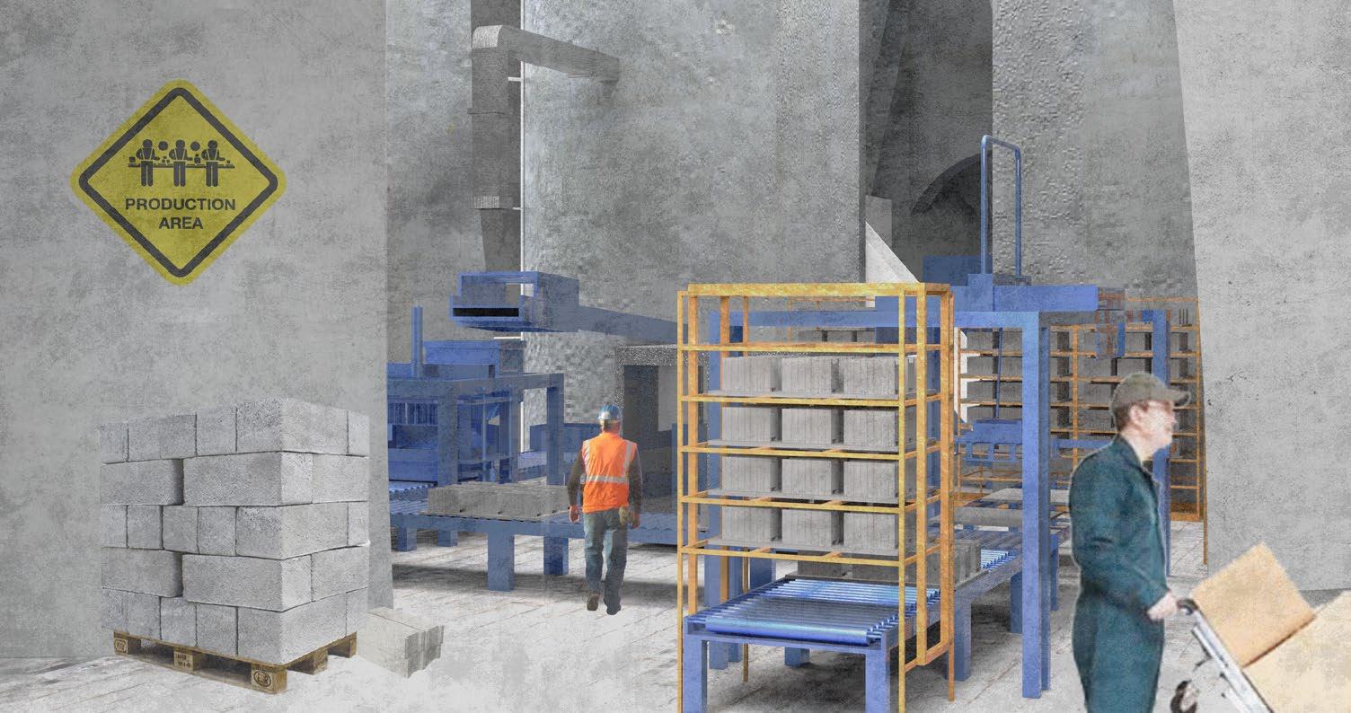 The chosen intervention part is the left-end corner of the terminal, where a holistic approach combines block manufacturing, social programs, and roof renovation to transform the space into a community gathering and educational hub. With the new design typology of modular concrete blocks serve a multitude of functions, including support for green roofs, integrated rainwater collection, cladding, and floor slabs. The integration of block manufacturing, social programs, and roof renovation envisions a seamless synergy, emphasizing the terminal’s conversion into a dynamic community space with educational facilities.