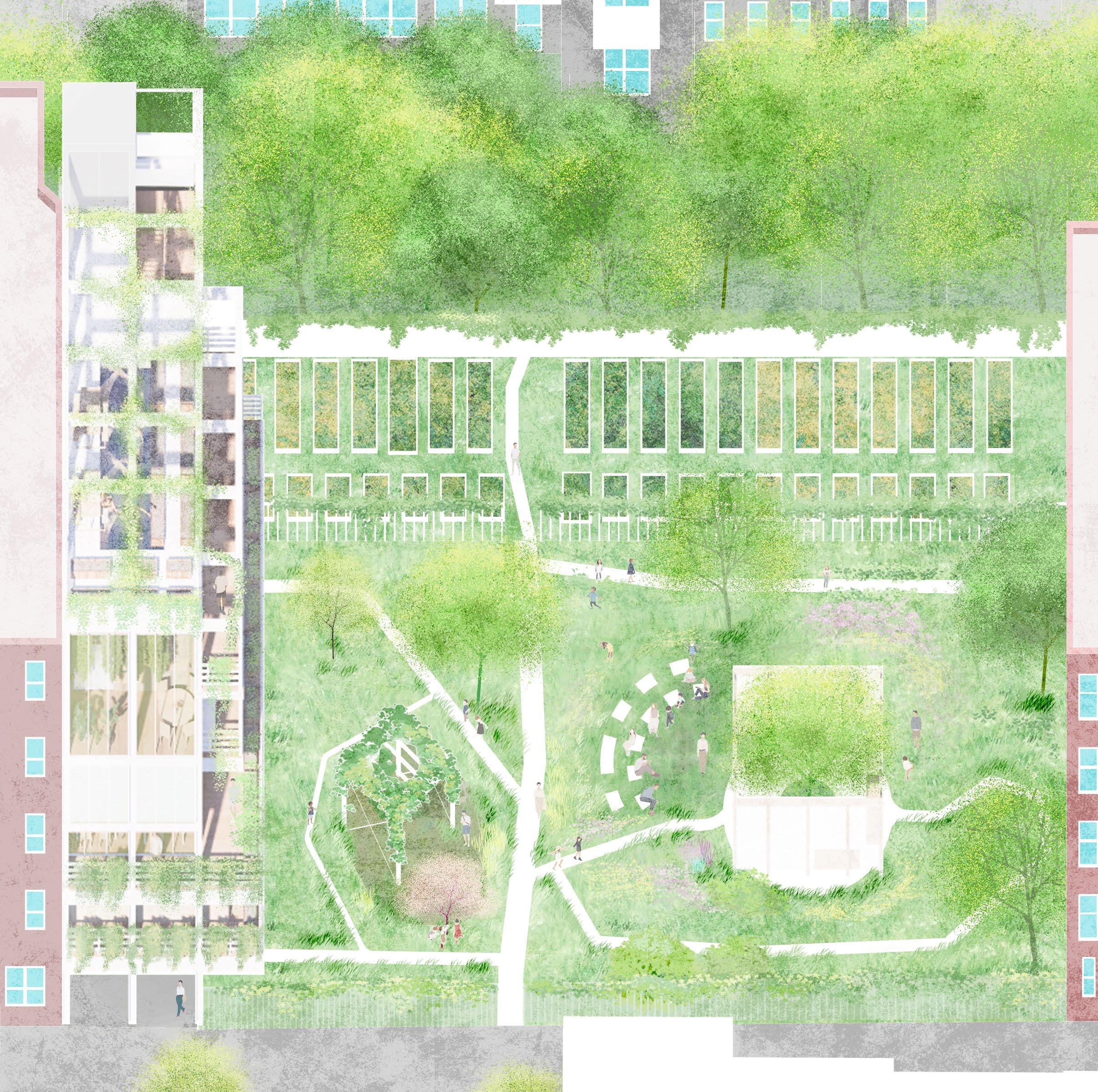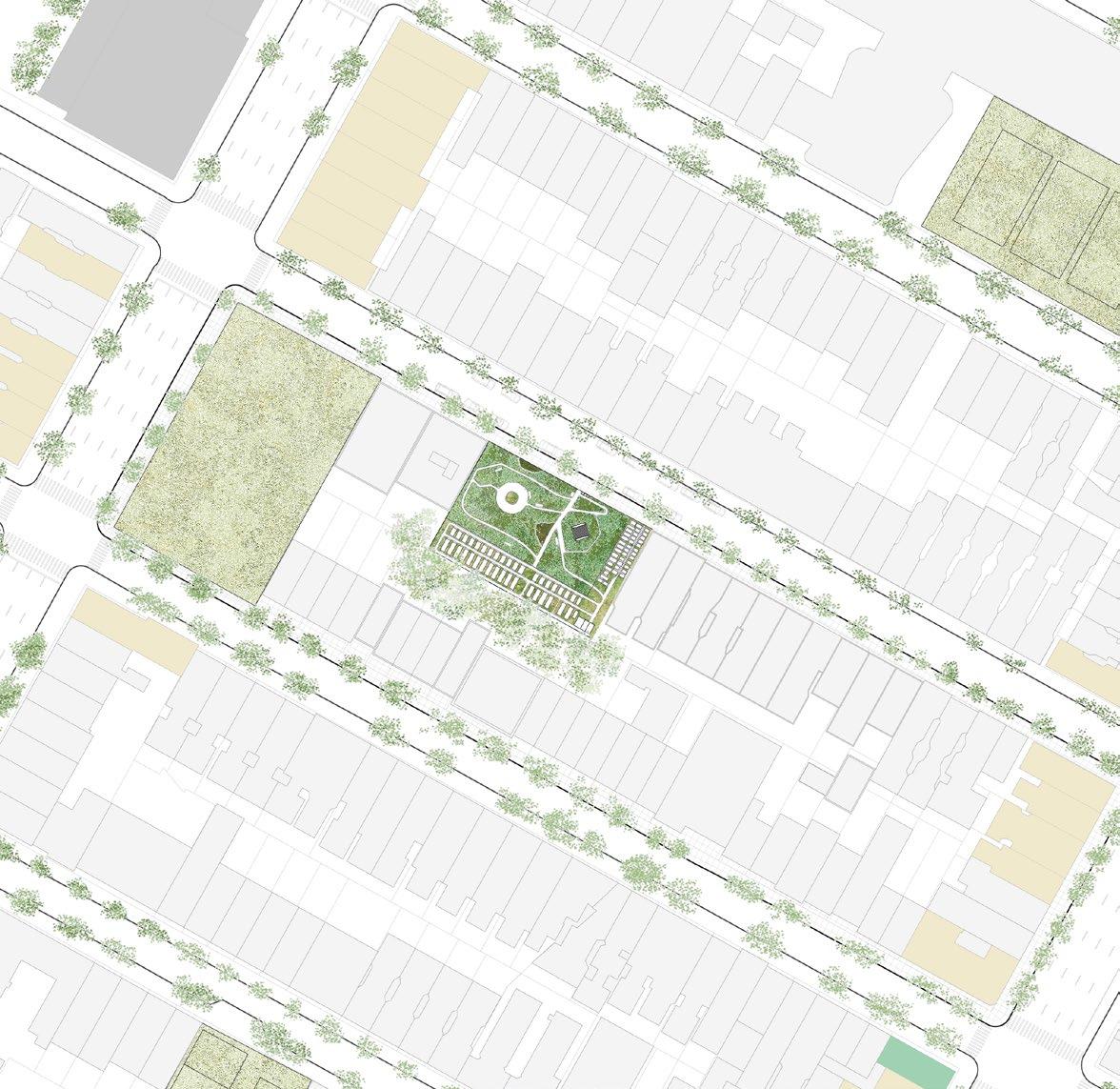one-third of the parking area into a permeable hybrid landscape that supports daily use and public events. The remaining parking is reconfigured as flexible, greener infrastructure capable of accommodating markets, seasonal festivals, and large civic gatherings
