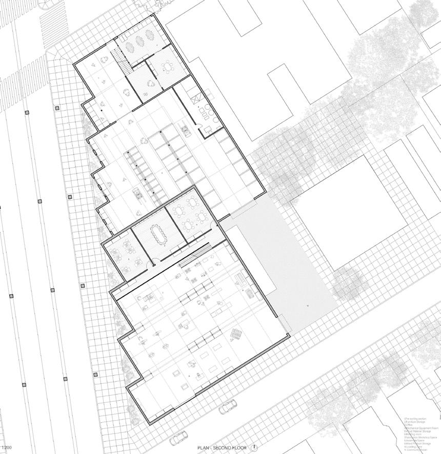 In terms of design, the woodshop embodies sustainability from its very architecture to its daily operations. Following the logic of the street, the overall form descend from the diagonal to create the uniform spaces for visual connection with the mainstreet and inviting the people to o look in. Natural light streams through strategically placed windows, fostering an inviting ambiance. The layout, meticulously planned for optimal workflow, ensures seamless movement between workstations and machines. Beyond aesthetics, sustainable practices are ingrained in the very materials that constitute the facility, with recycled and repurposed materials lending an authentic touch to the workspace.