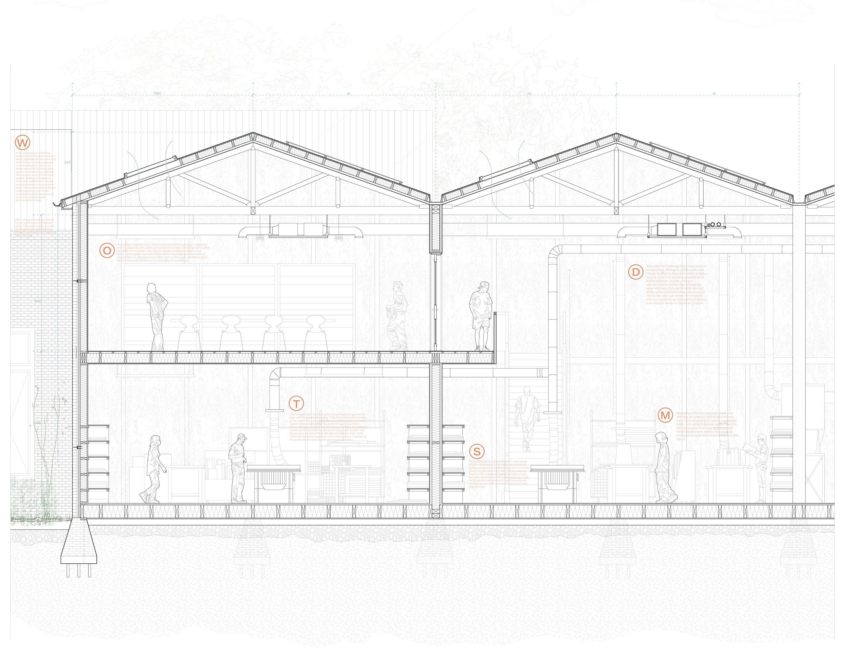 The 1:10 Detail section presents the logic and partial view of the woodworking zone.The strategically placed windows allow skylight and natural light to create an inviting ambiance. The layout, designed for optimal workflow, ensures seamless movement between workstations and machines. Sustainability is ingrained in the facility, with original materials and reclaimed wood constituting the structure, including columns designed for storage and transparent walls for tool and wood storage while maintaining a free space for machine mobility. In creating the ReWaste woodworking workshop, the aim is to go beyond just a physical space; it aspires to be a catalyst for community prosperity, generating revenue, fostering shared achievement, and promoting sustainable living conditions.
