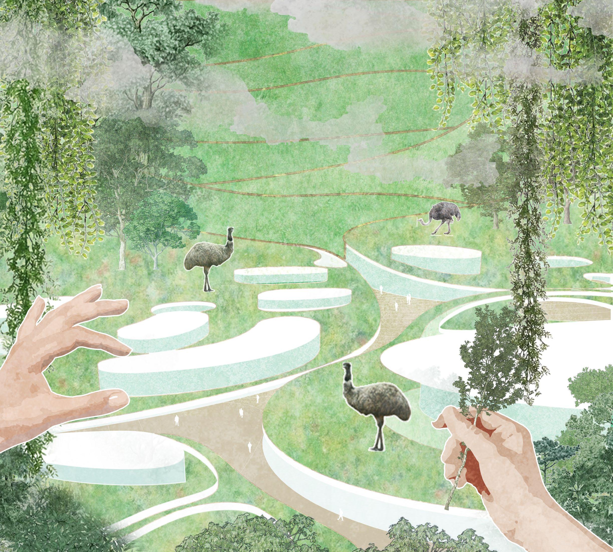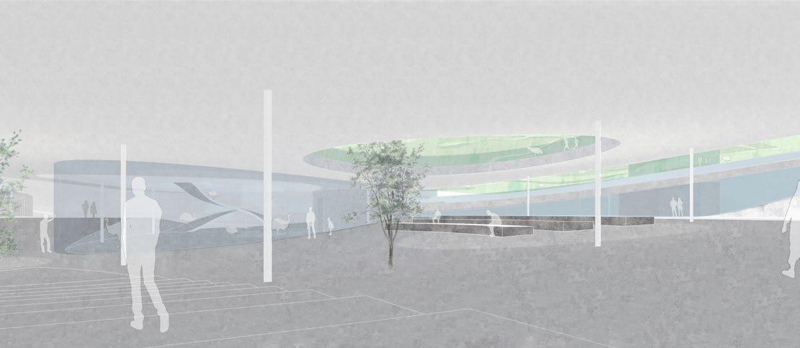 The design of an architectural complex that combines sightseeing, accommodation, and commerce is located at the intersection of Hongshan Zoo, Nanjing Station, Nanjing, China. As an important visiting location, the Hongshan zoo is located near the commercial center and train station. To reinforce the complexity of the site and reconsider the possibility between human and animals, the project Emu Gathering Organization is purposed to create a new habitat for emu near the Hongshan zoo. The habit of emu being close to humans makes it possible for more interactions between animals and humans.