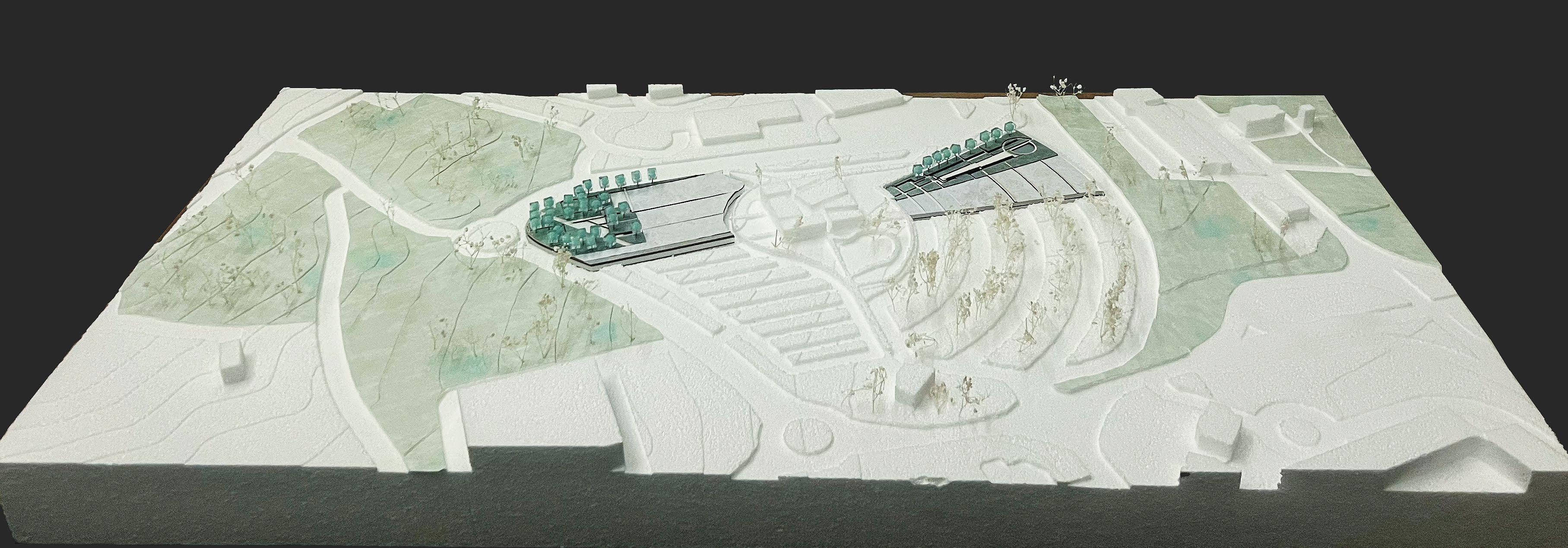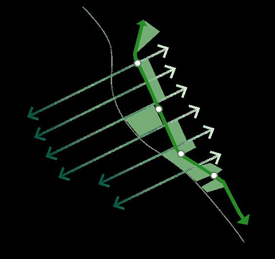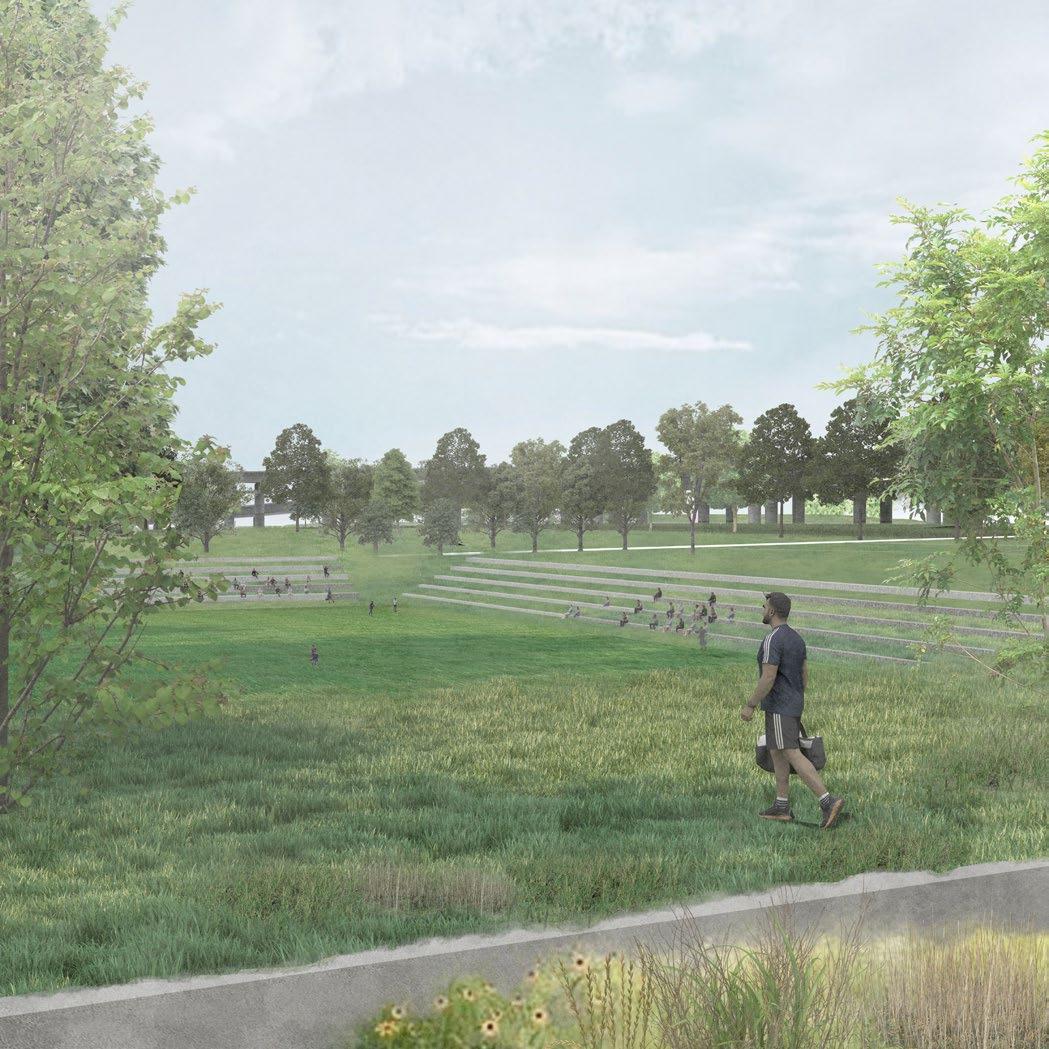 phases aligned with escalating climate conditions and by 2100, the BHCC field is transformed into a multifunctional anchor space, integrating shaded lawns, sports fields, and terraced landscapes that manage stormwater and provide climate refuge. The adjacent MBTA yard is reimagined as a linear park built upon remnants of former rail lines, reinforcing continuity through public access and ecological corridors.