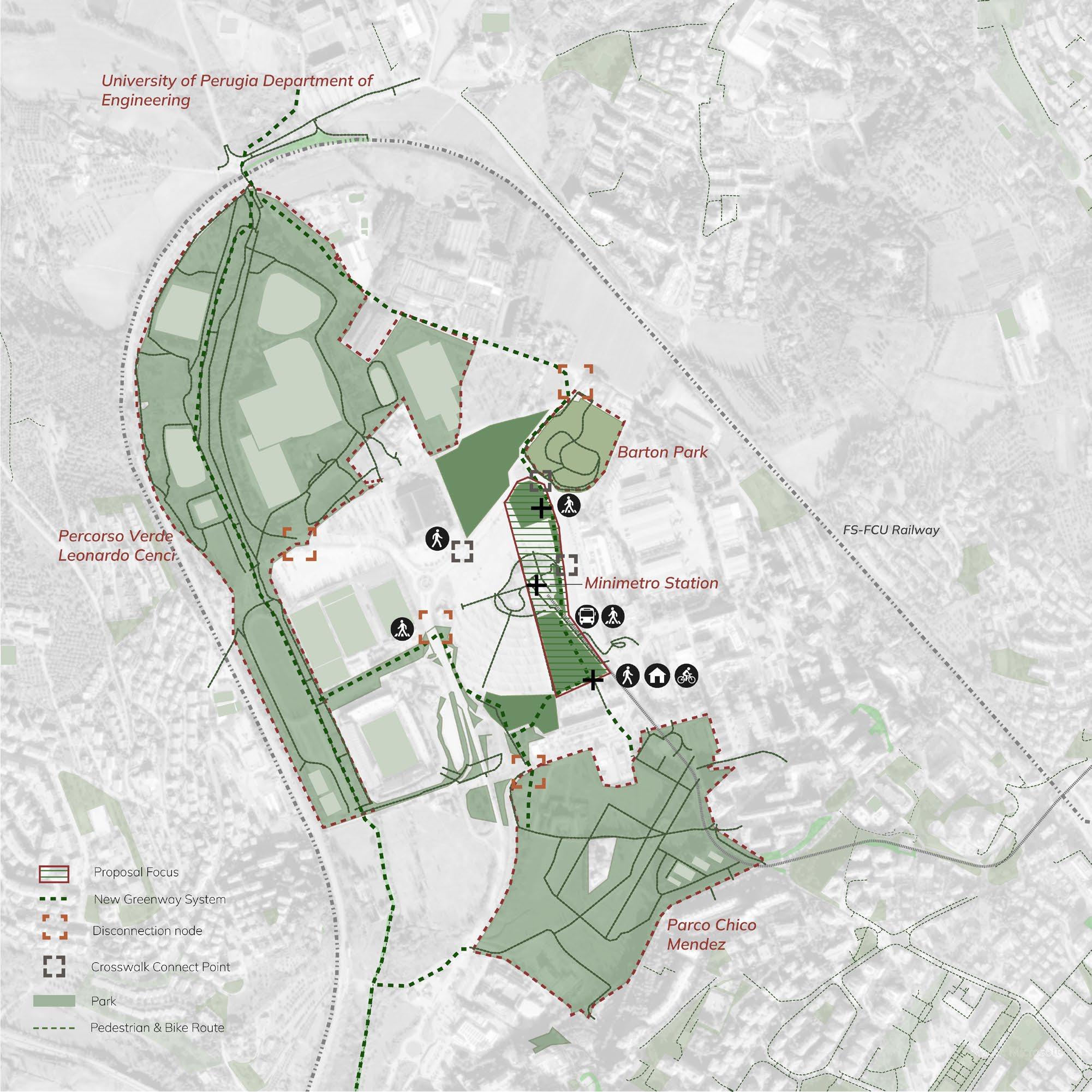 As a hybrid micro-city, Pian di Massiano balances parkland, sports facilities, event spaces, and transportation infrastructure, while acting as a critical connector between Perugia’s surrounding neighborhoods. Historically, the site was productive farmland before being redefined in the 1970s as a sports district, with the construction of the Renato Curi Stadium (1974) and the Percorso Verde park shortly thereafter.