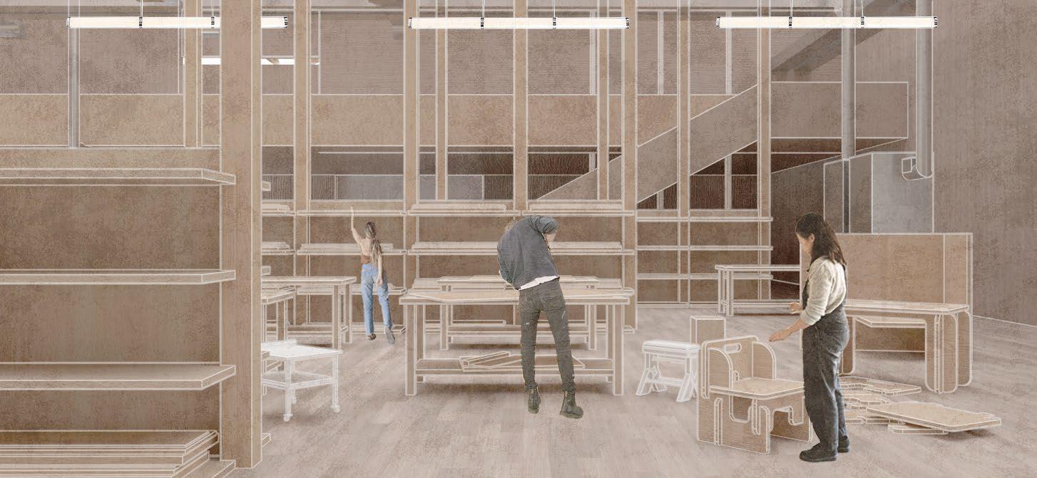 The envisioned waste collection and manufacturing process involve residents bringing their broken furniture or DIY wood products to the pre-sorting zone, followed by simple treatment and temporary storage for exhibition. After initial treatment, the Storage area will receive clean wood waste material, functioning as a collection point. The workshop serves as a pivotal component for producing reclaimed wood products and acts as a learning hub for the local community.