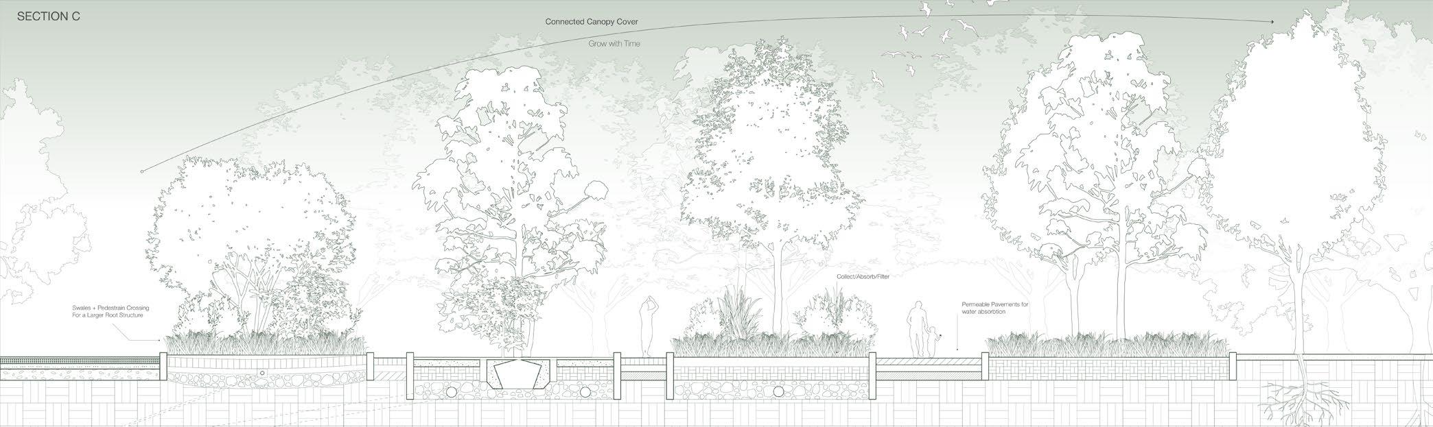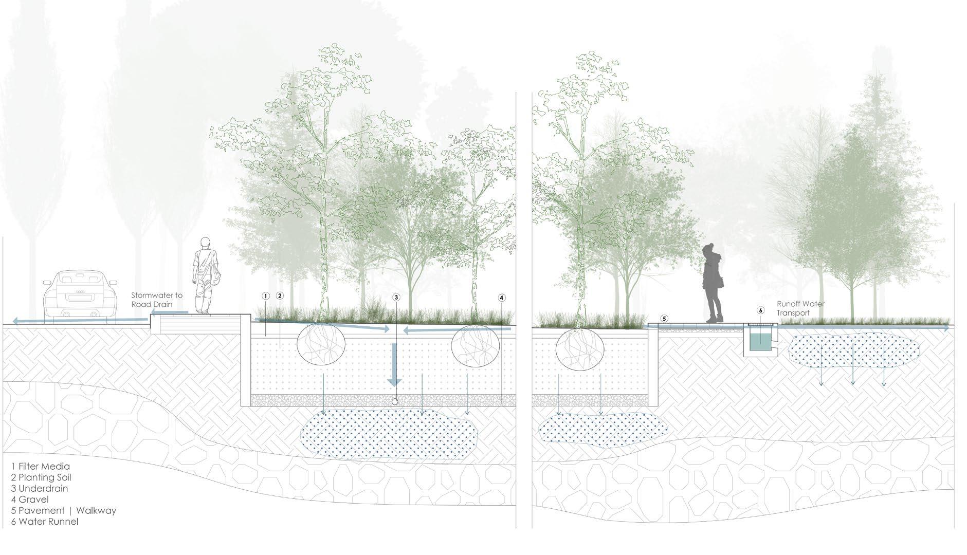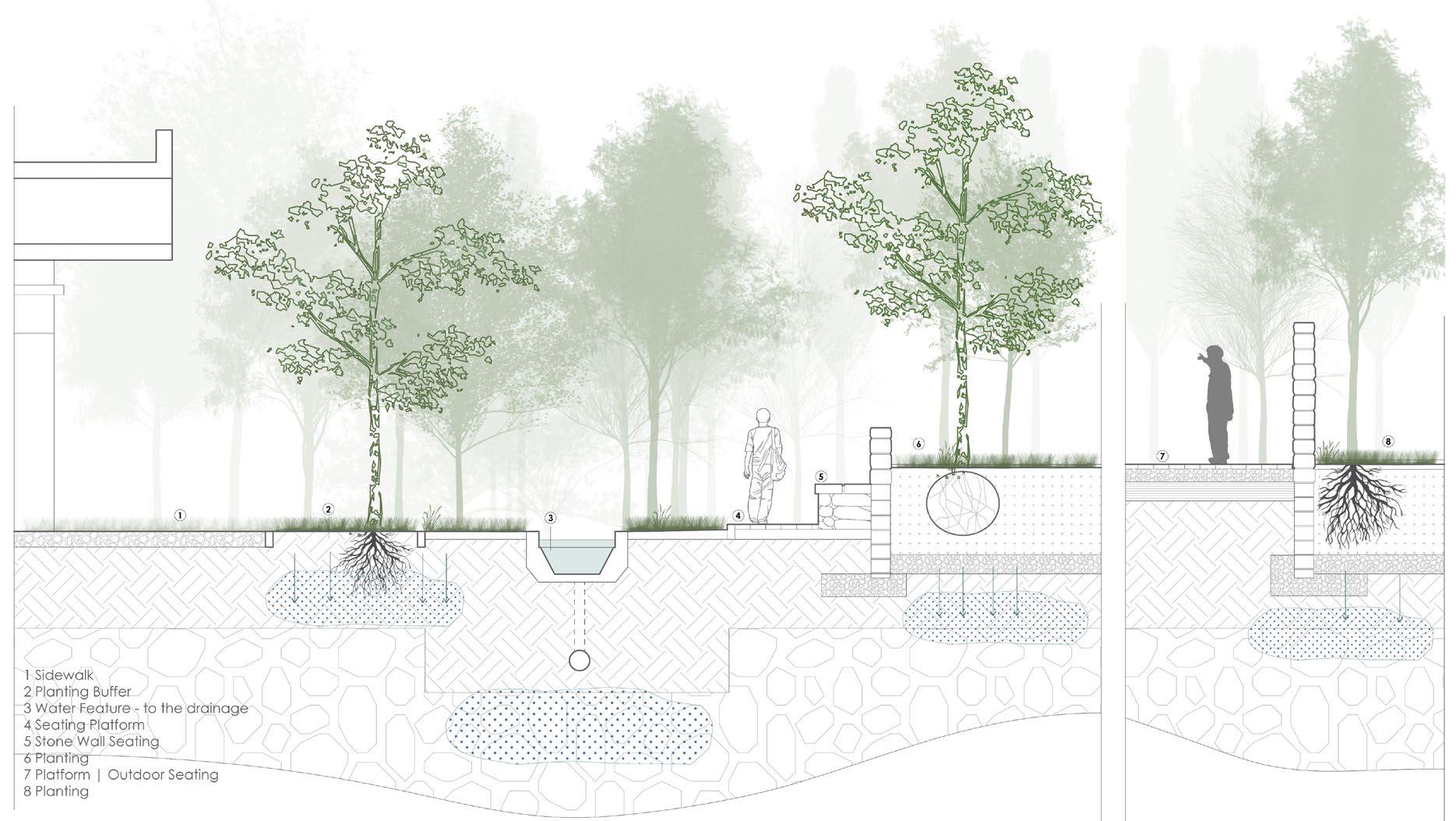 In the commercial zone, green roofs, bioswales, and retention ponds will reduce runoff, while pathways connecting to the nursery will support plant restoration. The transitional zone adds green paths along automobile-heavy areas, and the residential zone modifies landforms to slow stormwater before reaching the marsh, repurposing old pipes for playgrounds and water management.