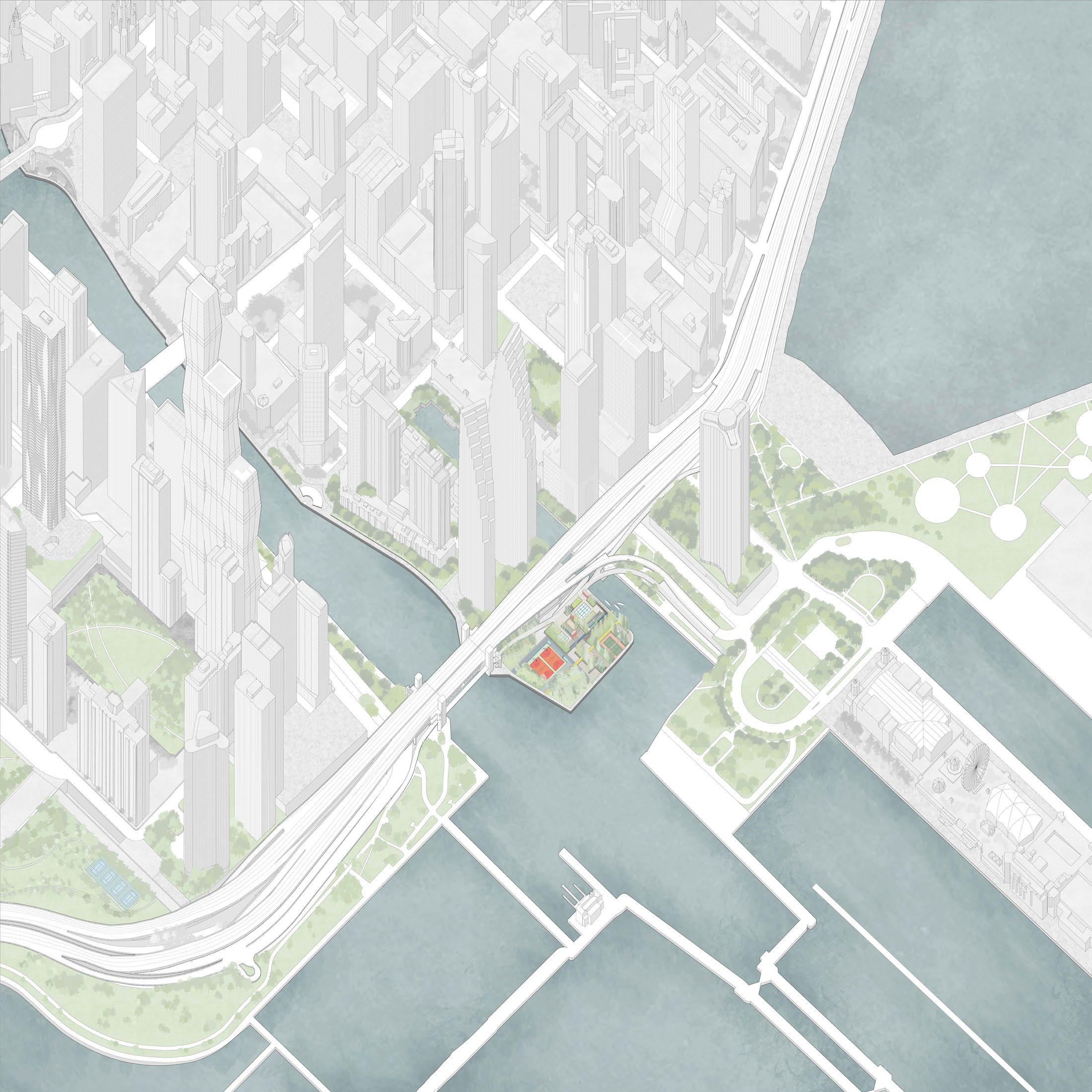 The Dusable Park located at the estuary of the Chicago River connected with the promenade of the city. The park was considered as the finished edge of the city skyscrapers. However, due to several reasons, the park was left over as a waste land till today. Under this notion, the project seeks to regenerate and renovate the preexistent land toward the typical Chicago fieldhouse while giving back some urban greenery to the Chicago city.