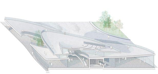 In terms of connection with nature, the indoor and outdoor spaces are blended through the use of micro-topography. Topographical elements are intervened in the inteior space to intentionally guide the tour and control the field of view.