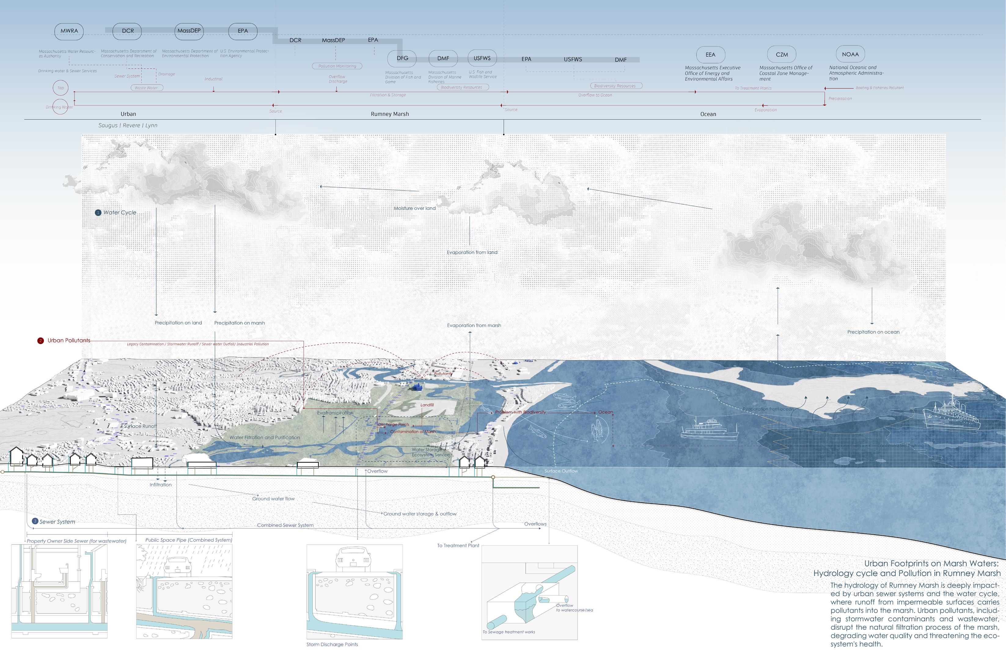 Rumney Marsh faces escalating threats from urban runoff, wastewater, industrial pollutants, ocean currents, and rising sea levels, compounded by leaks and contaminants from aging sewer systems and water mains. In response, the project proposes a reimagined edge that transitions seamlessly between urban and natural spaces. By analyzing the life cycle of infrastructure materials, it repurposes construction and demolition waste into functional elements like permeable surfaces, pavers, and erosion-control structures. These recycled components create a filtration layer to treat stormwater and reduce pollutants before they reach the marsh.