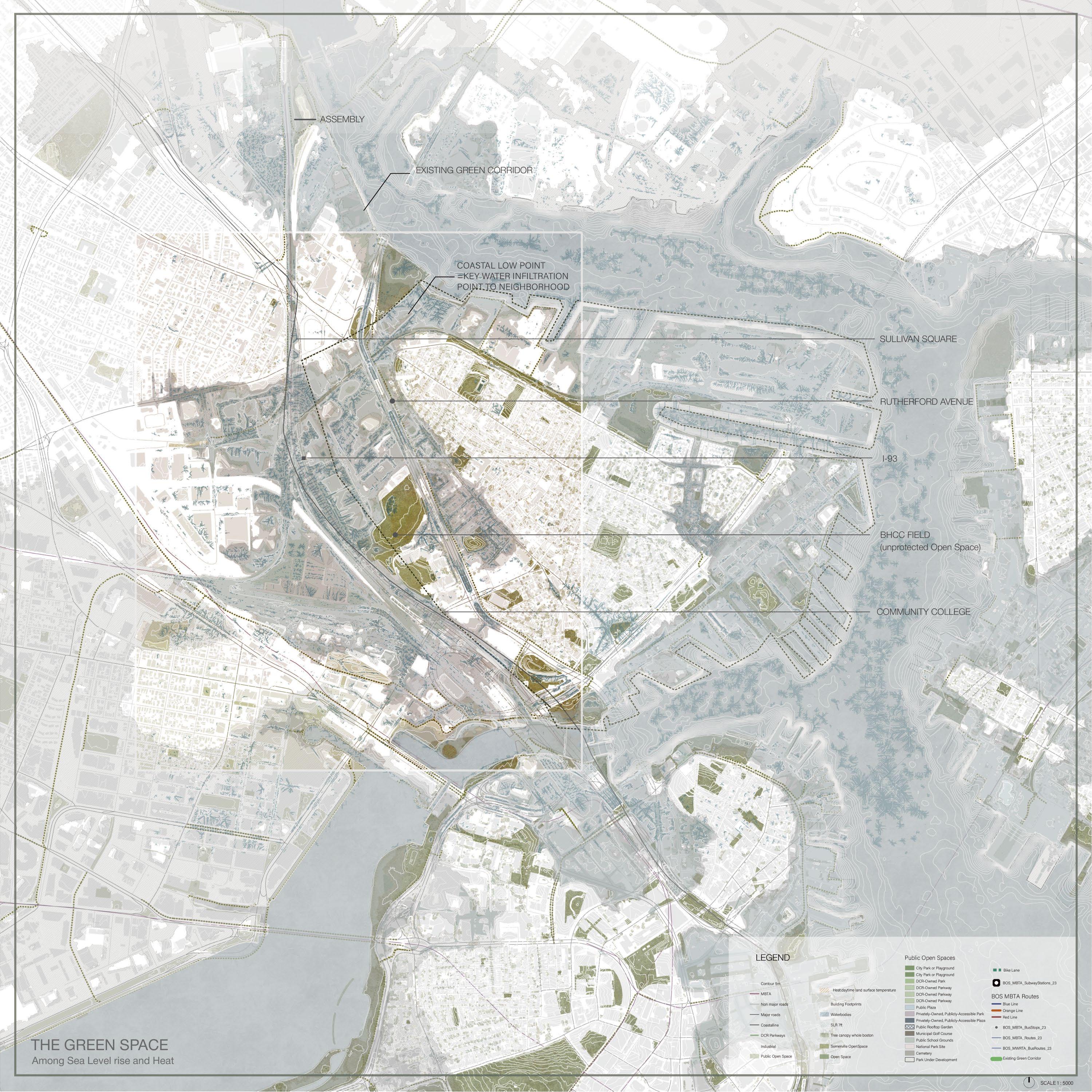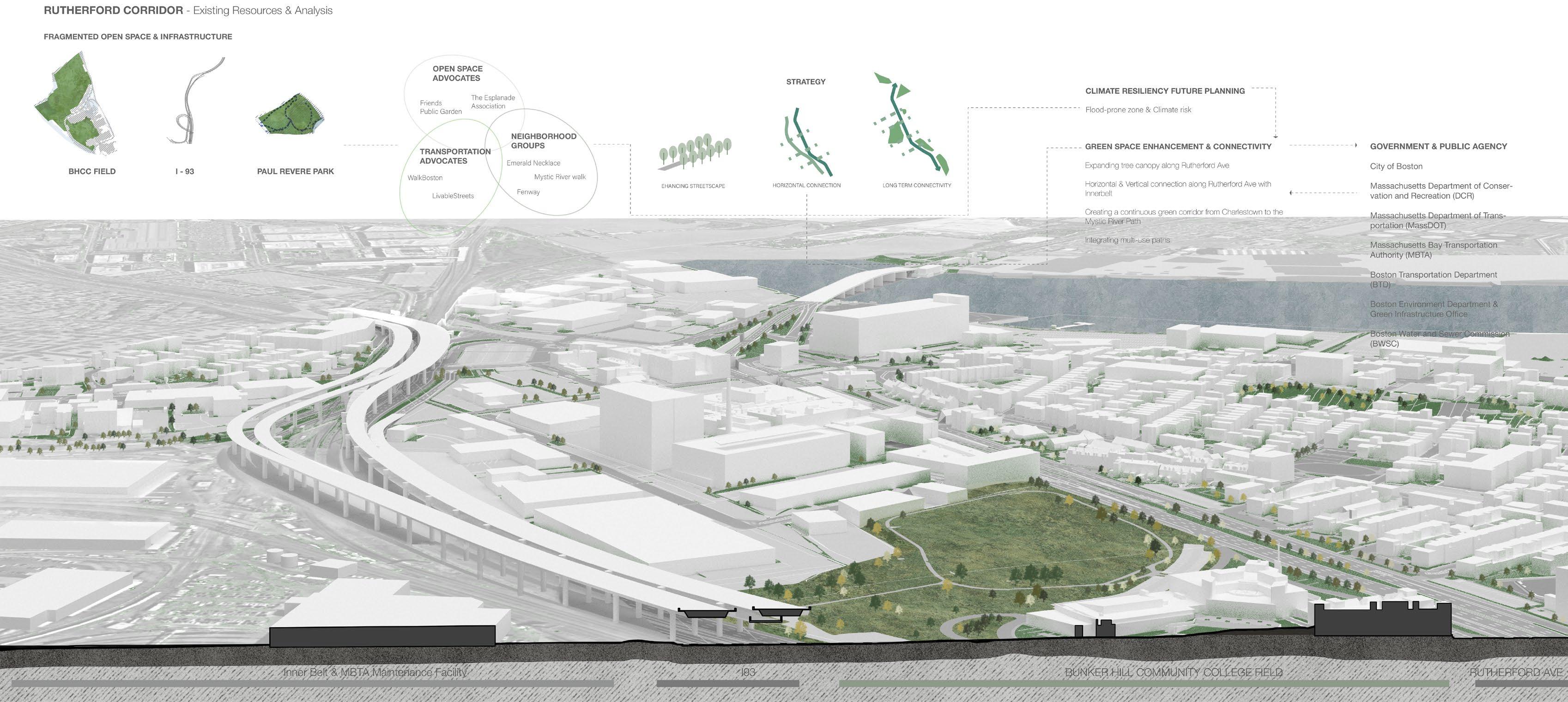 Rutherford Avenue—originally engineered for automotive use—now acts as a physical barrier within the urban fabric. Yet, its adjacency to civic, educational, and transportation assets presents a unique opportunity. The proposal reimagines this corridor as a resilient green spine: beginning at the BHCC field and extending outward to reconnect the fragmented edges of Charlestown.