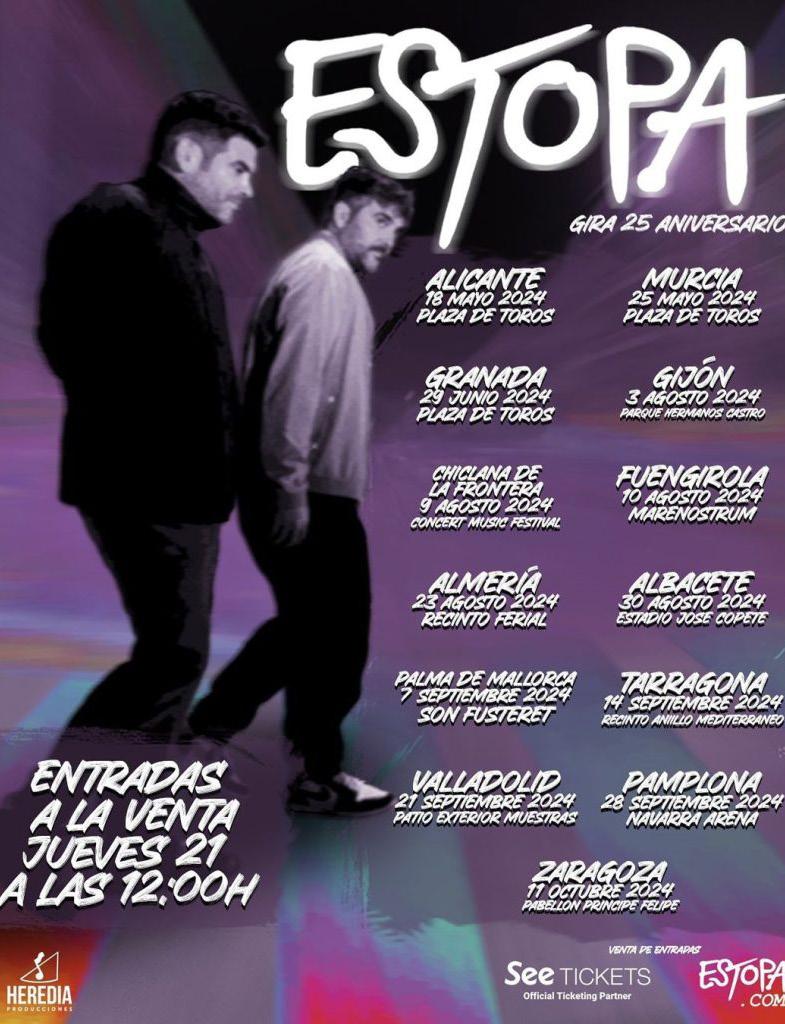 Con la celebración de sus veinticinco años en la música y la presentación del disco «Estopía» que será publicado en la primavera del 2024. Prepárate para vivir una noche única al ritmo de la rumba pop de temas históricos como «La Raja de Tu falda», «Como Camarón», «Vino Tinto» o «Tu Calorro».
