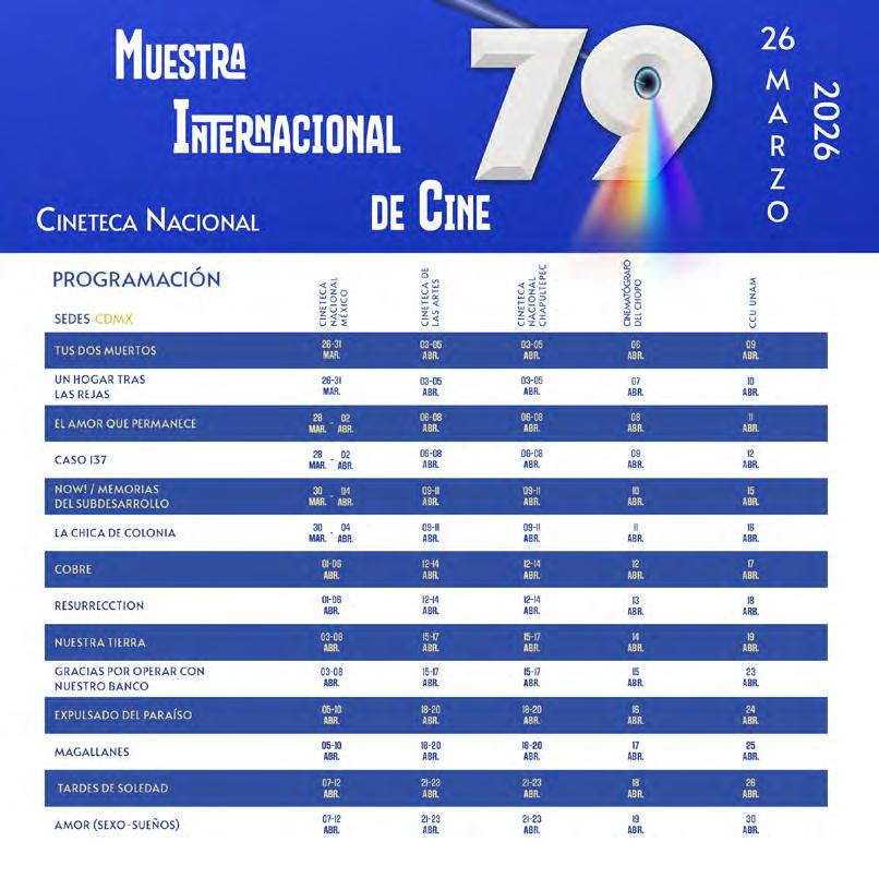 La 79° Muestra Internacional de Cine llega las salas de las tres sedes de la Cineteca Nacional con una selección representativa de lo más destacado en la reciente producción cinematográfica a nivel internacional. Una vez más, este ciclo cumple con la misión de la institución para promover y difundir propuestas fílmicas de notable relevancia, seleccionadas y premiadas en festivales como Cannes, San Sebastián, Mar del Plata, Londres y Toronto. Documentales, clásicos del cine, biopics, experimentos híbridos, etc., provenientes de múltiples latitudes como Cuba, Noruega, Portugal, Islandia, Corea del Sur, China y Palestina se dan cita en esta muestra de primavera 2026. En esta edición, México está representado por Cobre (2025), la nueva pieza dentro del particular universo del cineasta