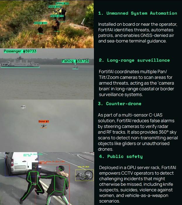 FortifAI is state‑of‑the‑art visual autonomy software that enhances existing systems with time‑critical visual intelligence and precise camera and UxV platform control. Our revolutionary, platform‑agnostic flagship product operates on low power edge processors and has been proven in the field on UAVs, UGVs, USVs, C‑UAS systems, long‑range surveillance cameras, and even an uncrewed submarine.