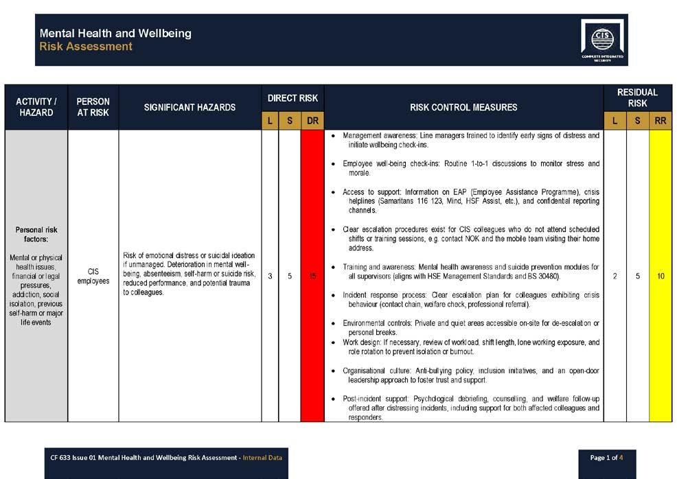 This risk assessment has been introduced to ensure that mental health and wellbeing risks are formally identified, managed, and consistently addressed alongside our existing workplace hazards, and forms part of our wider approach to employee welfare and risk management.