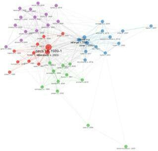 Para el análisis de la estr uctura intelectual, en primer lugar, se ha realizado un análisis de co -citación, en el que se identifican las citas de los documentos cuando son citadas por un tercero. l a relación de co -citación se muestra en la Figura 19. se identifican como los autores más citados e influyentes a davis (1989) y venkatesh et al. (2003) en el gr upo más extenso y Bélanger & carter (2008) junto con carter & Bélanger (2005) en el segundo gr upo.