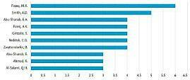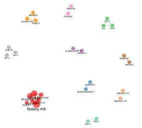 Para el análisis de la estr uctura social, se utiliza la red de colaboración o co -autoría. l a mayor concentración de co -auotoría se muestra en color rojo con siete autores entre los que destaca Faeq y al-salami. Por el contrario, gritzalis tiene un número pequeño de colaboraciones en comparación con el número de citas, tal y como se puede obser var en la figura 20.