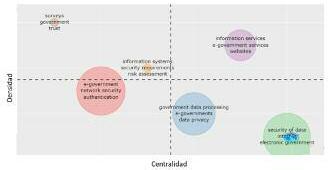 se identifican tres temas importantes para la constr ucción del campo científico ; “information ser vices”, “ egovernment ser vices” y “ websites”. los temas emergentes son “ e-government ” , “ network security ” y “authentication ” . como temas transversales se encuentran los recogidos en el cuadrante inferior derecho ; “ government data processing”, “ e-governments ” ,”data privacy ” y, por otro lado, con menor relevancia; “security of data”, “internet” y “electronic government ” .