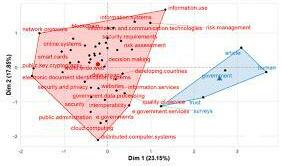 Para el estudio de las dimensiones se utilizó el análisis de correspondencias múltiples, que ha sido desarrollado para estudiar el tipo de variable más frecuente en la investigación social de campo : las variables cualitativas o de nivel de medición nominal (Parra- olivares, 2011). en el análisis se identifican dos dimensiones, como se obser va en la Figura 16. l a primera dimensión se identifica según los términos englobados en color rojo, información, seguridad, privacidad y su relación con el “ e-government ” , representando el 17,85% de los casos, y una segunda dimensión que representa 23,15%, con los términos artículo, humano, confianza y encuesta. es destacable como el término “ government ” se encuentra en ambas dimensiones de manera central.