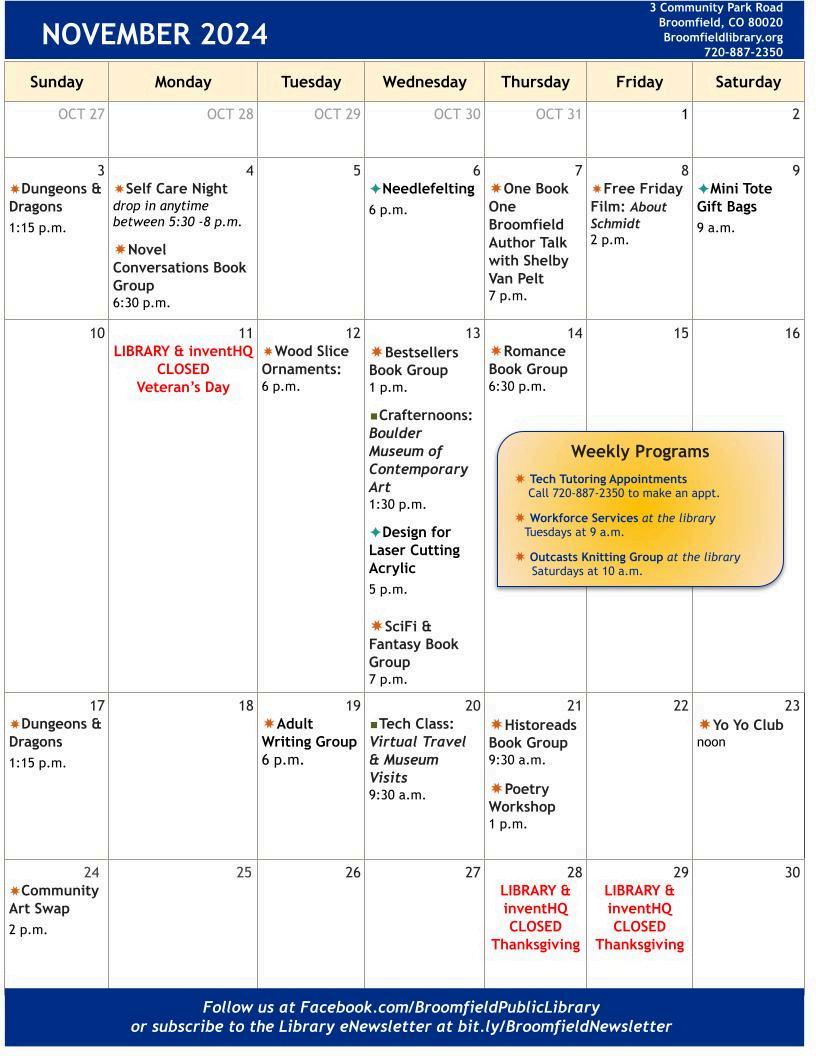 Check out bit.ly/bfadultmeetups for information on all the Adult Community Groups! Library Closures: Nov. 11, 28 & 29 Dec. 24 & 25