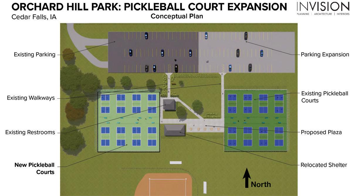 The City of Cedar Falls is partnering with the Cedar Falls Pickleball Club for a pickleball expansion in Orchard Hill Park. The total cost for the project is estimated at $400,000. The Cedar Falls Pickleball Club is fundraising half of the needed funds. The anticipated project includes: