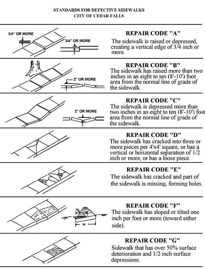 The 2024 Sidewalk Assessment Project has roughly 417 properties as part of the project. The contractor awarded the contract is JQ Construction out of Washburn, Iowa. Construction should begin around the middle of July and be completed within 60 working days. Once the project is complete, the Engineering Division will close out the project with the contractor and create a breakdown of expenditures. The assessment for each property will be mailed out to respective property owners around the first of the new year. The figures show how sidewalks are evaluated when inspected.