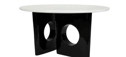Fun, unusual and striking, this beautiful table has a glossy round white top sitting sturdily on two chunky black stands with cut-out circles zillihome.com