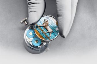 champagne colour. The moon-phase indicator for each dial is distinct, and Chou’s vision for the champagne-coloured dial model has come to life in a truly fantastic way, with the phantommoonlight gold disc representing the moon hidden behind an inky-black cut-out, slowly appearing and disappearing as the moon waxes and wanes.