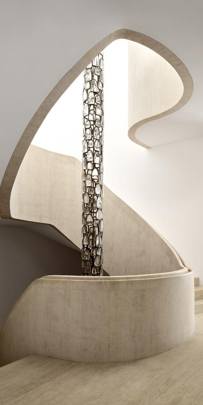 The grand room is perfect for hosting elegant events, no matter if it is an intimate gathering or a big celebration, a cozy ambiance is felt by charming traditional touches The sinuous curves of the hand-carved stone staircase spiral between three floors, complemented by the artisanal-cut 750-piece Cabochon Column pendant that casts brilliant patterns of ethereal light. Designed by BURDIFILEK in collaboration with Canadian lighting designer Matthew McCormick