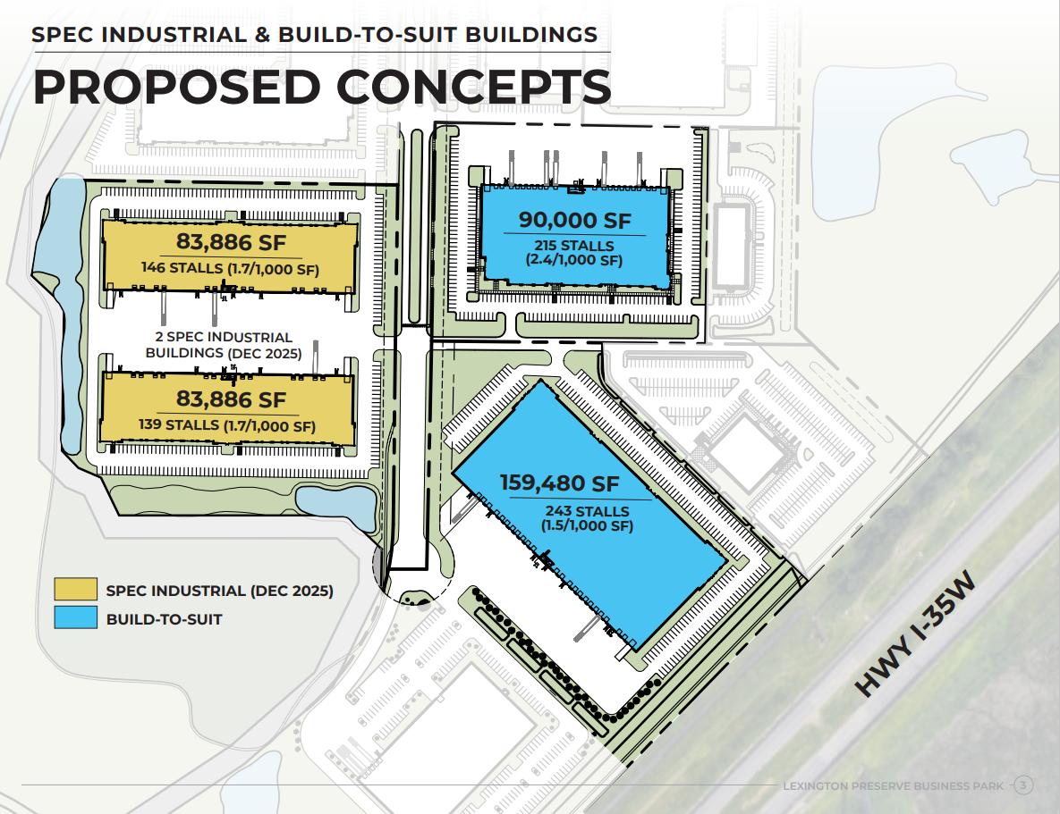Each building will total approximately 83,866 square feet and is being designed with both function and appearance in mind. To complement the architectural character of the surrounding business park, the buildings will feature architectural precast concrete, aluminum composite material (ACM) panels, and windows with an anodized aluminum finish. These materials provide durability while presenting a modern, professional appearance to the heavily traveled I-35W corridor.