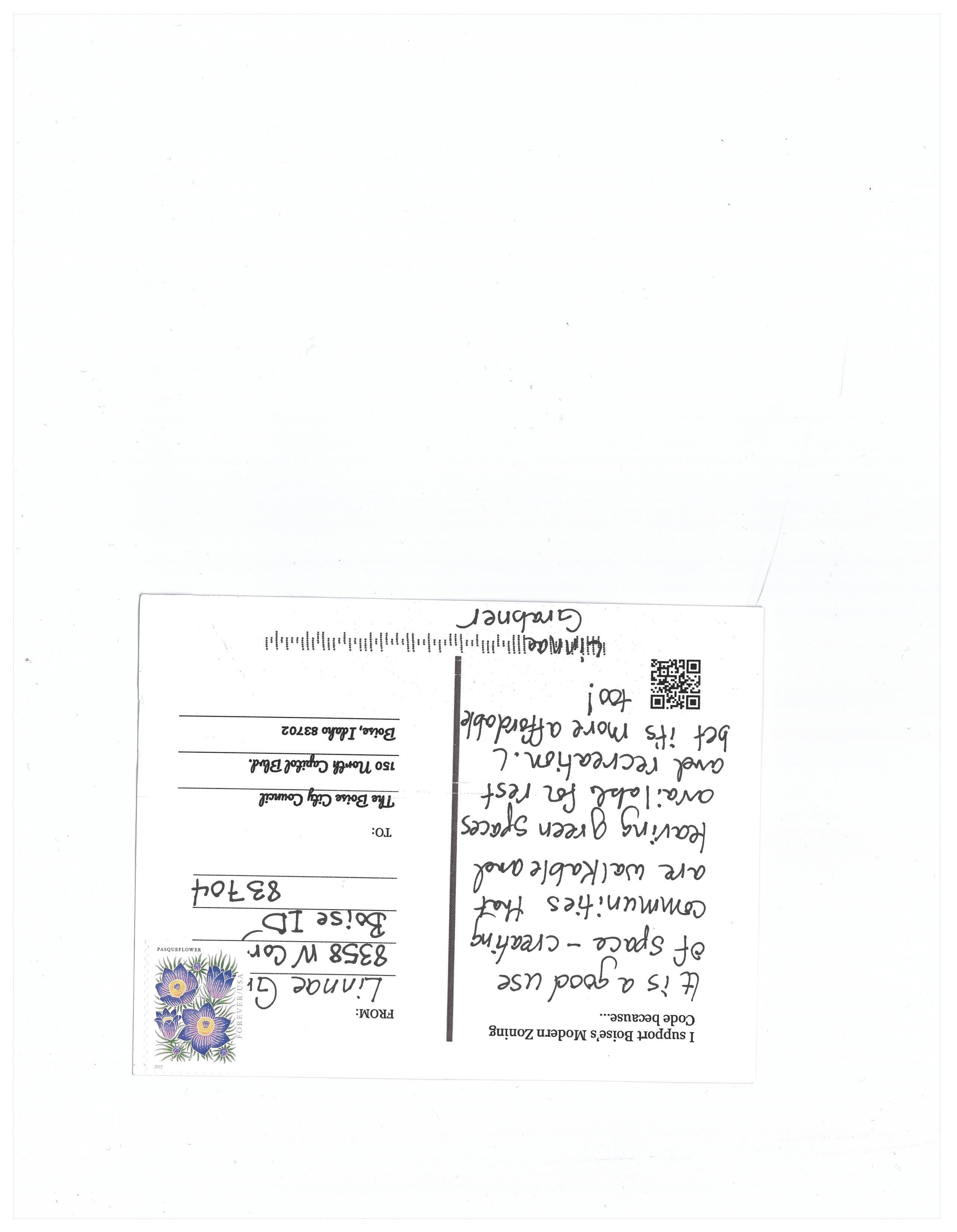 all privacy disappeared! It was horrible. Pulling in behind parked cars to let others drive by is also horrible and potentially dangerous! 3) it has been mentioned that Boise needs affordable housing. The rewrite has incentives for affordable housing but there is no accountability written in. How do you enforce the rules about who lives in the “affordable house?” And how is “affordable “ defined. According to the numbers I have seen, I can NOT afford a home in Boise. I do not make over 80k per year and there are maybe 25% of the people here than afford per those numbers and probably have homes. What about those who make 10.00‐ 20.00 per hour? What about the single parents? What about those living in cars and RV’s or tents? How are these people getting affordable housing for them? They are not making even 40k a year? This rewrite has not one thing for these people. The rewrite does not actually guarantee any affordable housing for those who actually need it. Affordable for those making 30.00 and up ‐ maybe. I hope that these things are considered and not just the work that was put in for the last few years. The rewrite needs to be revised to make sure all people are represented by the one they have voted for, that developers are paying for the infrastructure and shoving higher property taxes down the throats of existing homeowners ( many who have no kids, but would have to fund schools) and actually tackling h to e affordable housing ‐ for real, not just words! Sincerely, Teri Gardner 211 W Elwood Dr.