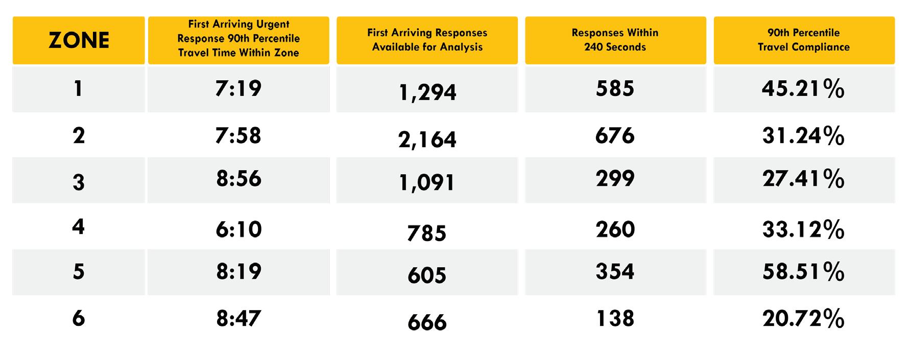 Travel time 90th percentile to urgent responses by first arriving primary response apparatus within a zone, regardless of zone assignment or agency. This is the cumulative effect when the department’s primary response apparatus are not the first on scene