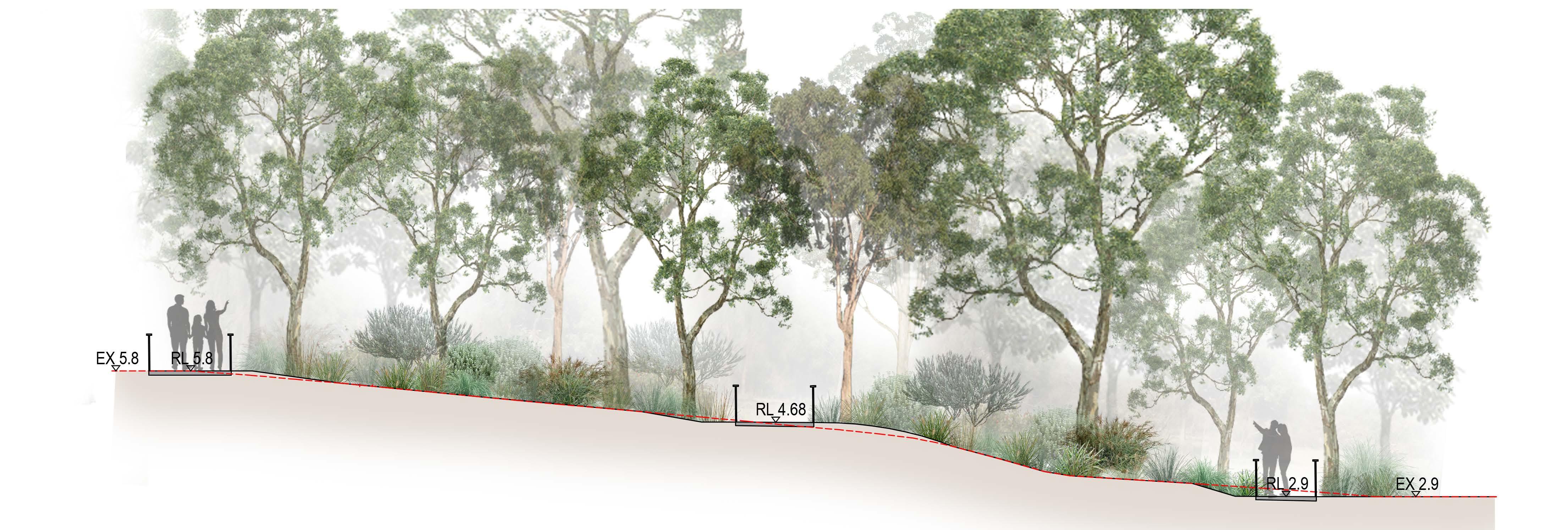 5. MASTERPLAN 22 MAJORS BAY RESERVE PARK MASTERPLAN PLACE DESIGN GROUP OCT 2022 SECTIONS I MASTERPLAN EXISTING GROUND LINE SECTION AA | NEW ACCESSIBLE RAMP TO ARTHUR WALKER RESERVE | 1:100 1:14 Ramp Bush Regeneration Bush Regeneration Existing Shrub Concrete Path 1:14 Ramp 1:14 Ramp NULLAWARRA AVE NORMAN QUANDONGPL NIRRANDAST WILGAST NORMAN HEATH AUGUSTASTMAJORS BAY ROAD DEAKINST BRADDON RICKARD KEY AA