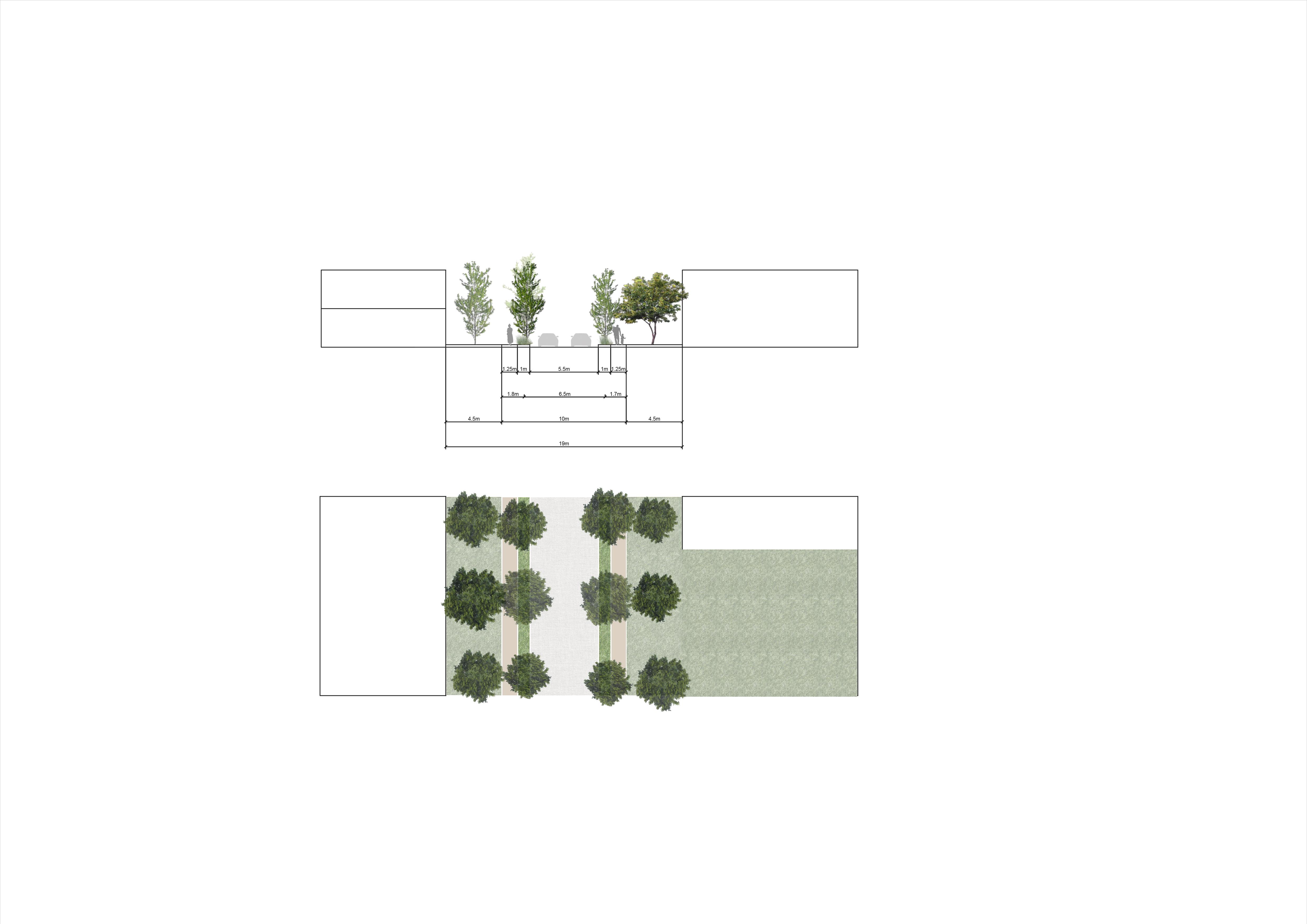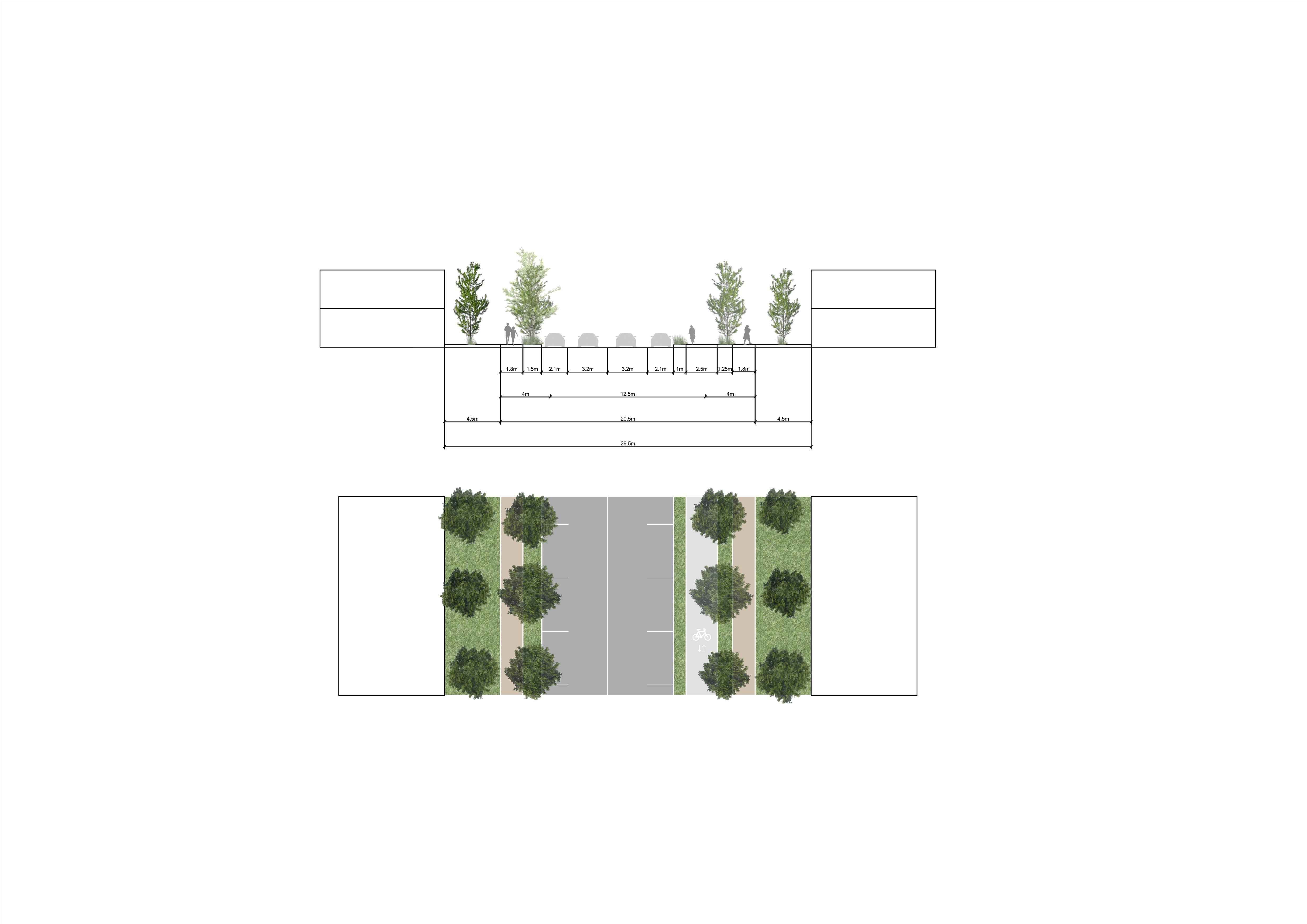 As a pedestrianised lane, flush kerbs and a paved road surface will delineate the shared intended use of the road. Wide portions of significant planting will also be introduced to the space to enhance comfort and appearance.