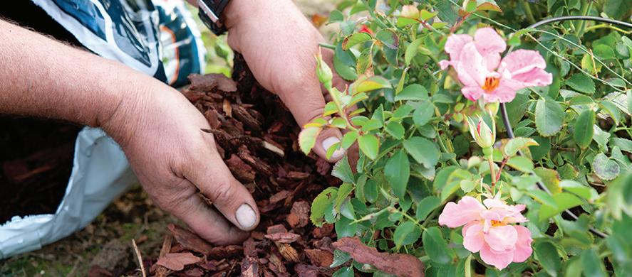 3. Add mulch to maintain about a 3-inch blanket on beds and around trees to help reduce evaporation and cool the soil by up to 10 degrees in the summer. Never pile mulch up around trunks or stems, but instead, arrange it as a shallow bowl.