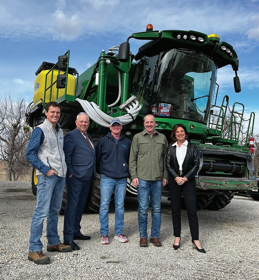 Iowa Secretary of Agriculture Mike Naig (second from right), City of Cedar Rapids Mayor Tiffany O’Donnell (right), City Manager Jeff Pomeranz (second from left), and Iowa Soybean Association conservation agronomist Evan Brehm (left), on a farm tour hosted by Jim O’Connell (center), one of the City’s partners in the Middle Cedar River Watershed project.