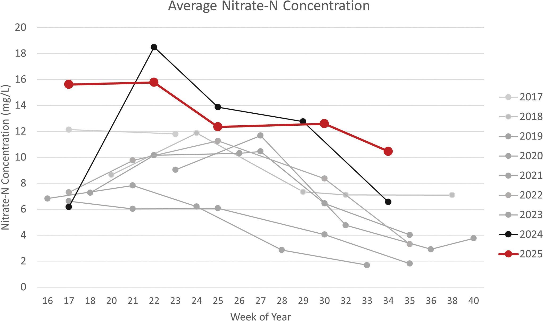 Figure 1. Average nitrate concentration for all monitoring sites per sampling event, 2018 – 2025. Nitrate concentrations in 2024 and 2025 were notably higher than previous years due to rain events that flushed nitrate stored in the soil profile during the drought conditions of previous years. (Graph created by Iowa Soybean Association)