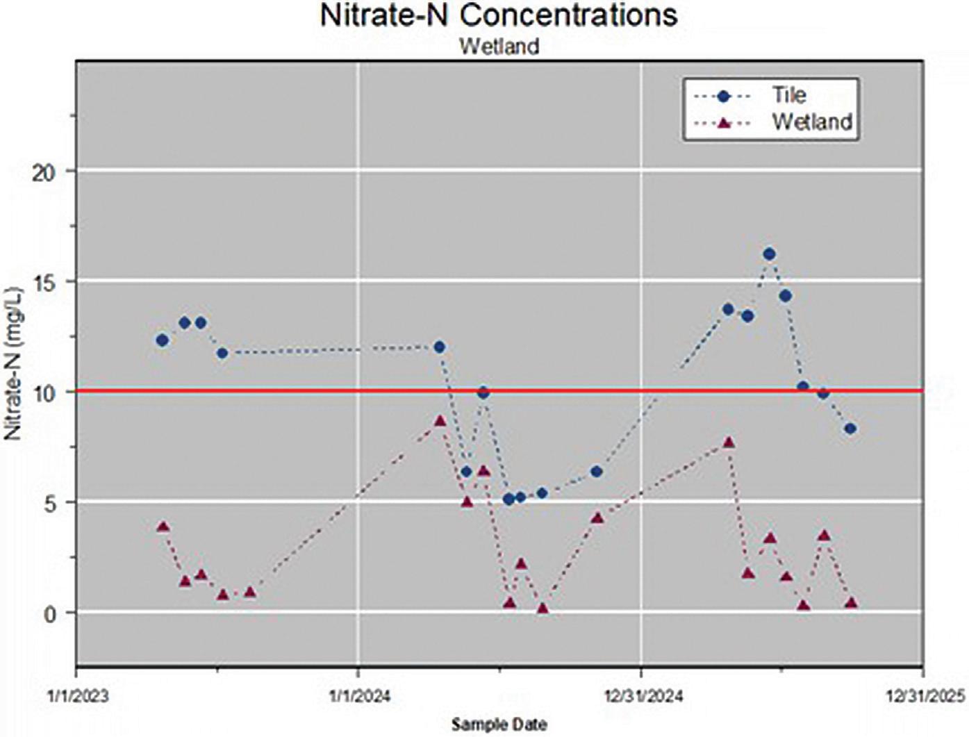 Figure 3. Sampling results from a nutrient removal wetland on a farm in Linn County, near the Cedar Rapids Northwest Water Treatment Plant. The three years of data show higher nitrate levels in the tile drainage water entering the wetland, and lower nitrate levels at the outlet of the wetland. (Courtesy of Iowa Soybean Association)